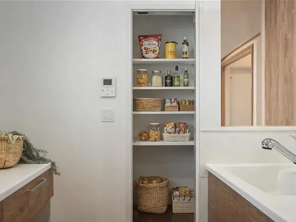 階段下を活用した収納は、パントリーとしても使えるスペースです。食材のストックや調理器具などをすっきり収納でき、限られた空間を有効活用した設計が毎日の家事を快適にサポートします。