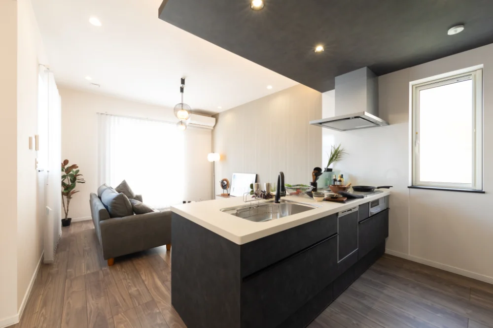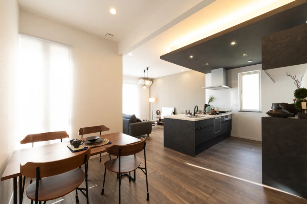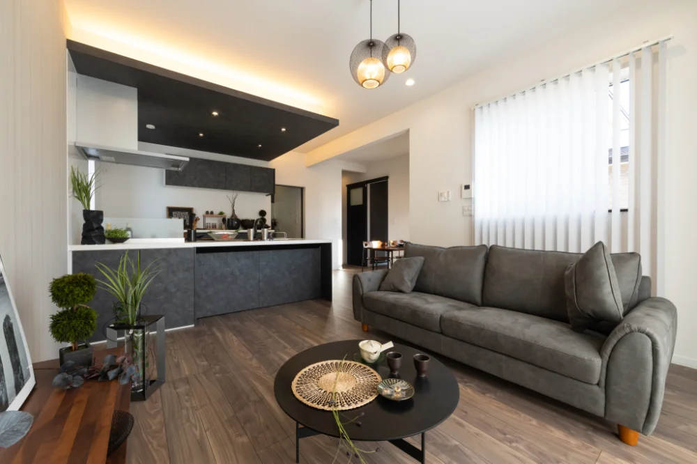 ■ブラック×ウォルナットの落ち着いた空間に和の趣をプラス