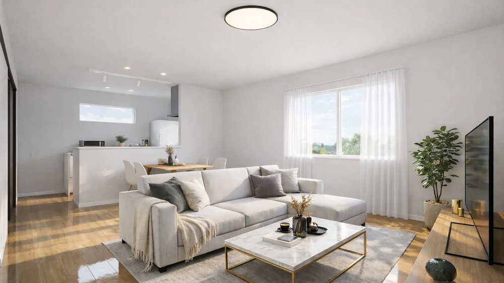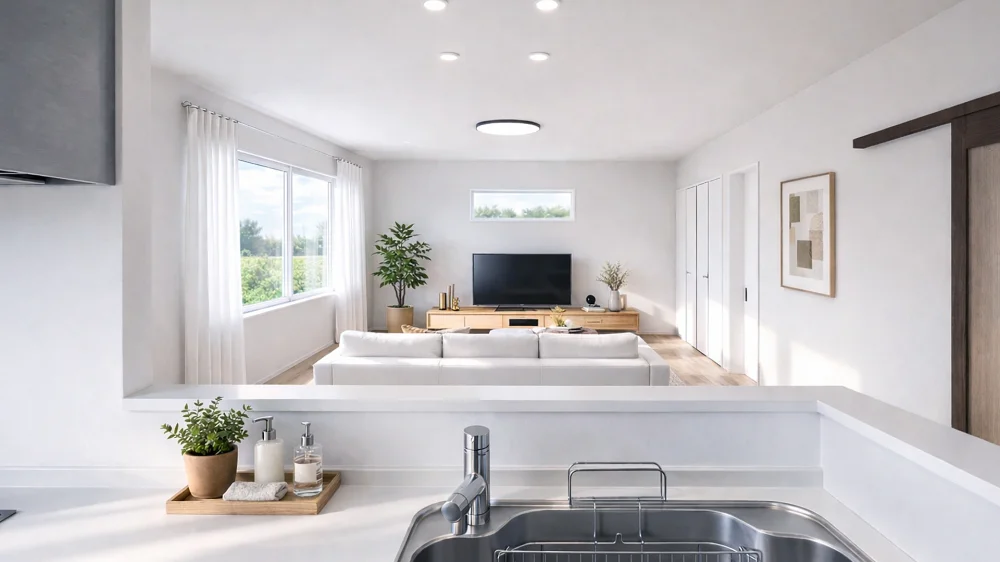 ■ホワイト×ナチュラルウッドでまとめた、落ち着きと温もりのある内装デザイン