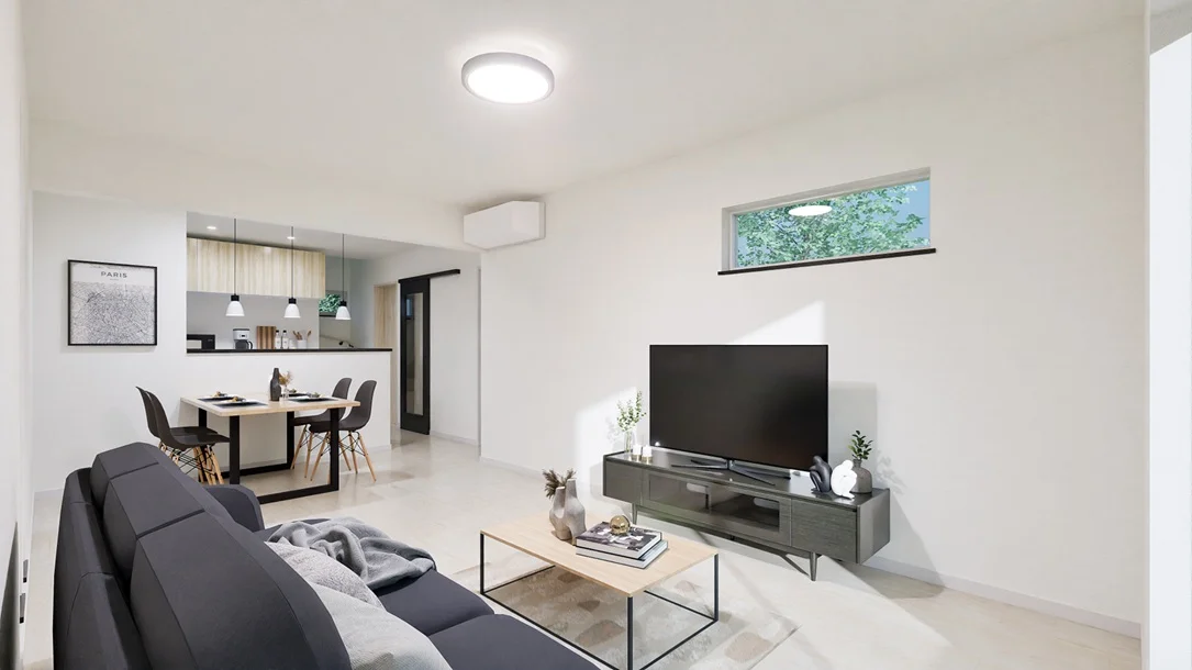 ■リビングには縦スリット窓やTV上窓を配し、プライバシーを守りながらも光を採り入れます。