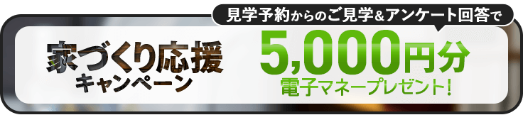 家づくり応援キャンペーン!前日までの予約見学&アンケート回答で最大5,000円分の電子マネープレゼント! 家づくり応援キャンペーン!前日までの予約見学&アンケート回答で最大5,000円分の電子マネープレゼント!