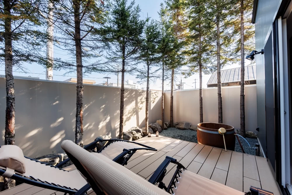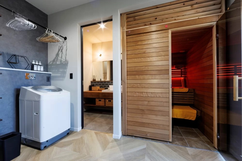 好きな時にお気に入りのアロマでサウナに入りたい・・そんな理想を叶えるご自宅用サウナを完備しています。サウナで汗を流した後は、専用のプライベート外気浴スペースへ。視線を気にせず、自然の風を感じながら、心と体をしっかり「ととのえる」最高のリラックスタイムを過ごせますね♪