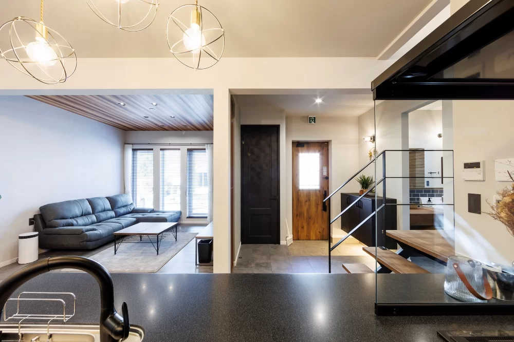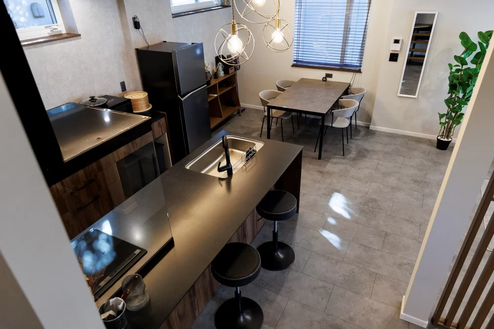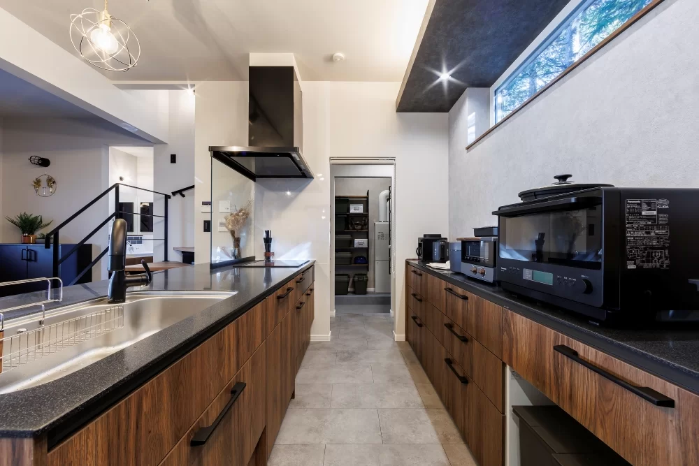 深い木目がもたらす温もりと、ブラックの洗練された表情が調和するキッチン。カウンターを中心に家族が自然と集い、穏やかな時間が流れる。そんな大人のかっこよさを感じる空間です。