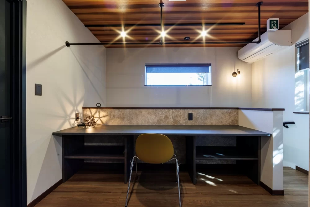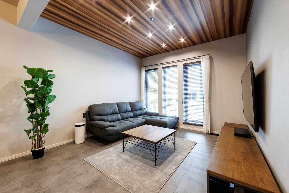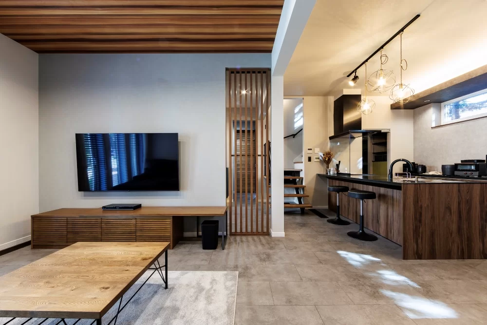 天井高を上げ、開放感あふれるLDK。間接照明が優しく灯る空間は、どこにいても家族の様子がうかがえる、一体感のある間取りが特徴です。玄関ホールとの間は、アクセントとなる木製ルーバーで緩やかに仕切るなど、遊び心にあふれた演出をちりばめています。