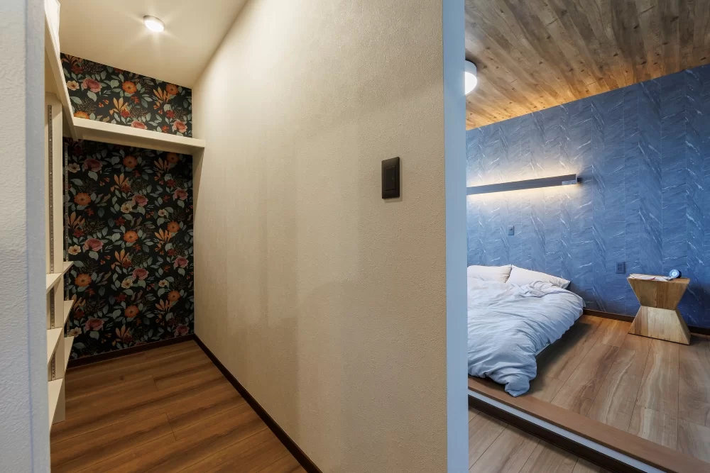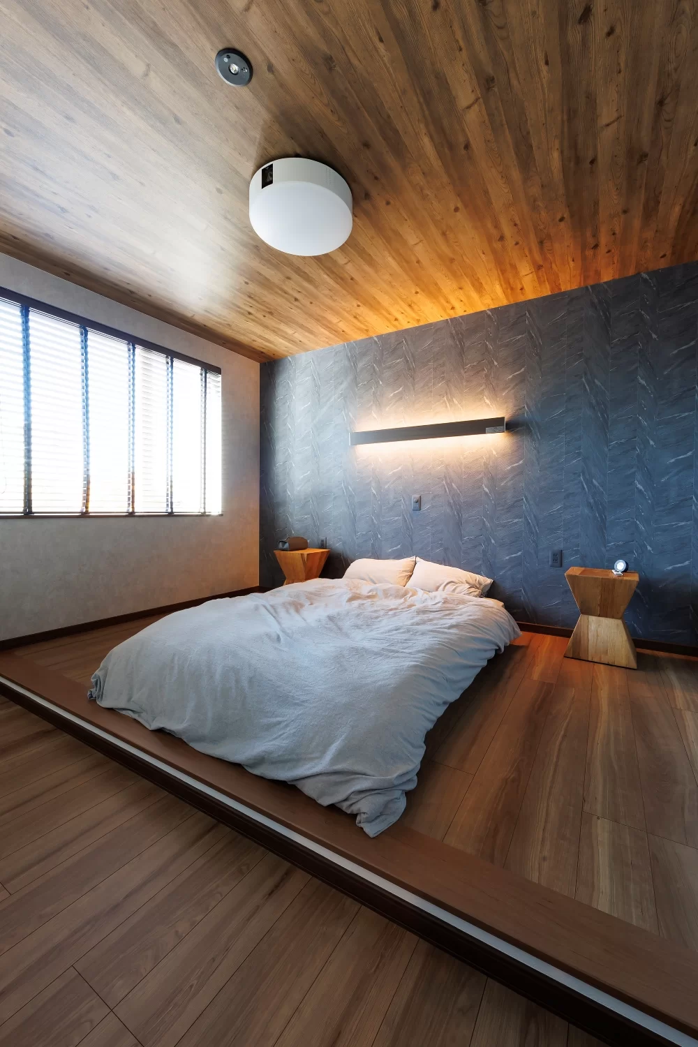 段差を設けた小上がり仕様が、主寝室に落ち着きを与えるデザイン。ウォークインクローゼットはたっぷりの収納力で、暮らしに整然とした美しさをプラス。心からくつろげる主寝室です。