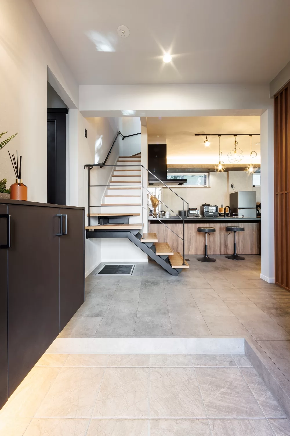 玄関を開けると、存在感のある鉄骨階段がお出迎え。お出かけ時も帰宅時にも、お顔を合わせられる開放的な玄関は、自然と会話が生まれ、家族の距離が一層近づきます。