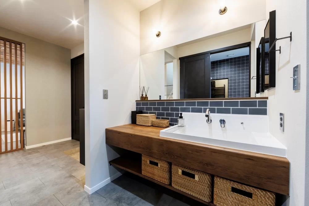 玄関ホール横に設置した洗面化粧台は、帰宅後すぐに手を洗えるので、ウイルス予防にも◎!忙しい朝も家族がゆったり並んで身支度ができる幅広タイプを採用しています。