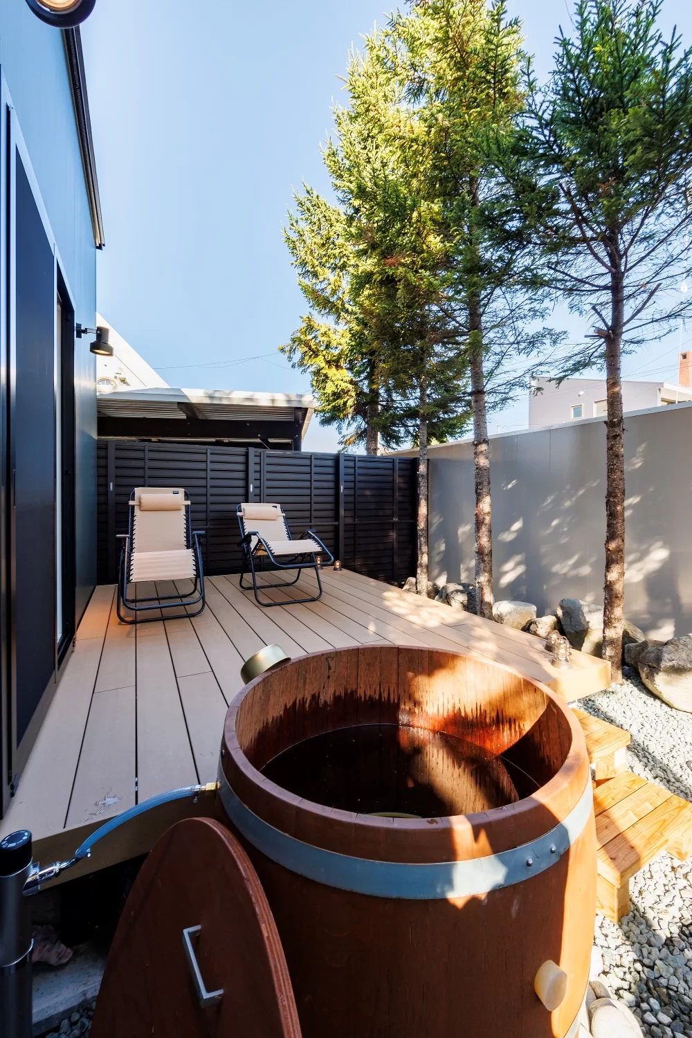 好きな時にお気に入りのアロマでサウナに入りたい・・そんな理想を叶えるご自宅用サウナを完備しています。サウナで汗を流した後は、専用のプライベート外気浴スペースへ。視線を気にせず、自然の風を感じながら、心と体をしっかり「ととのえる」最高のリラックスタイムを過ごせますね♪