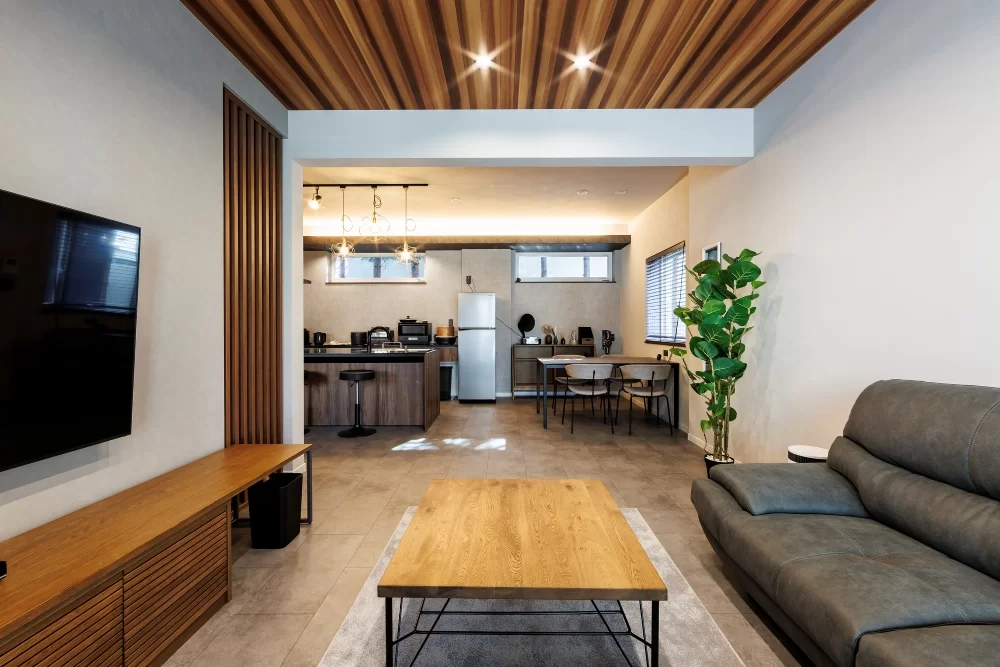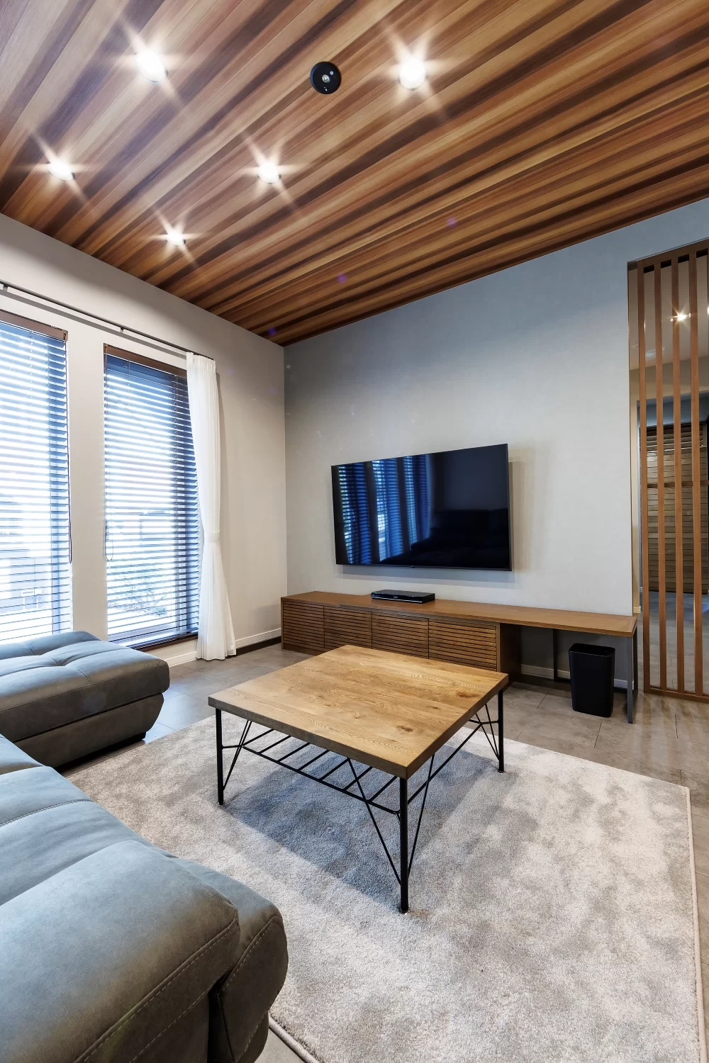 天井高を上げ、開放感あふれるLDK。間接照明が優しく灯る空間は、どこにいても家族の様子がうかがえる、一体感のある間取りが特徴です。玄関ホールとの間は、アクセントとなる木製ルーバーで緩やかに仕切るなど、遊び心にあふれた演出をちりばめています。