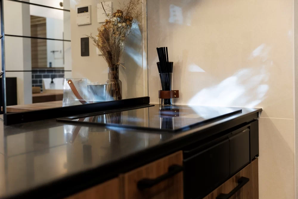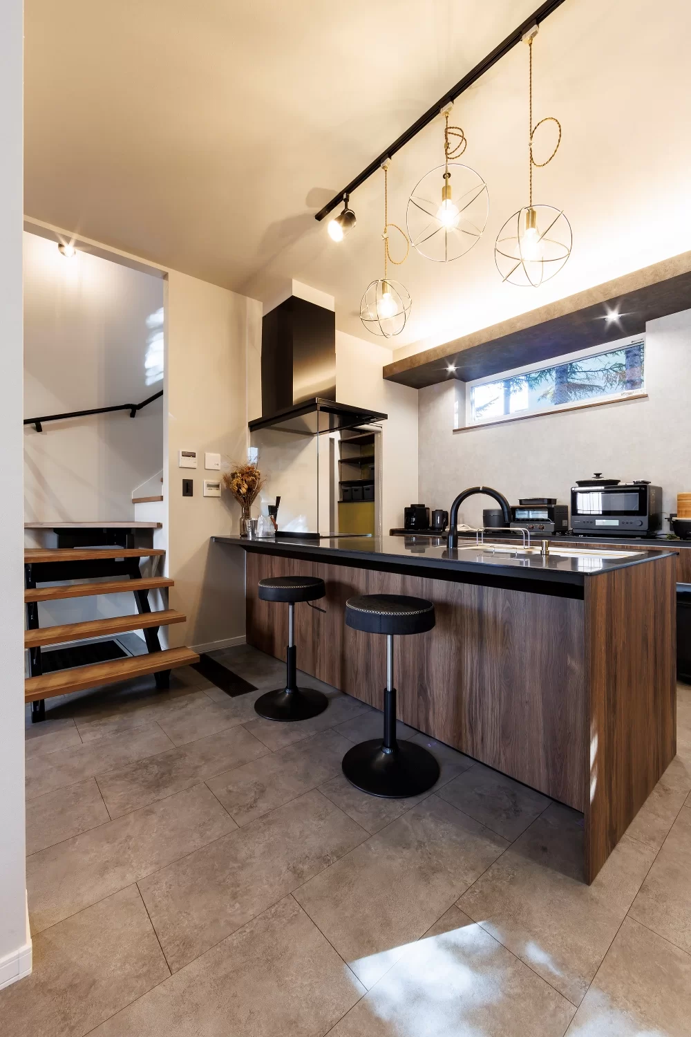 深い木目がもたらす温もりと、ブラックの洗練された表情が調和するキッチン。カウンターを中心に家族が自然と集い、穏やかな時間が流れる。そんな大人のかっこよさを感じる空間です。