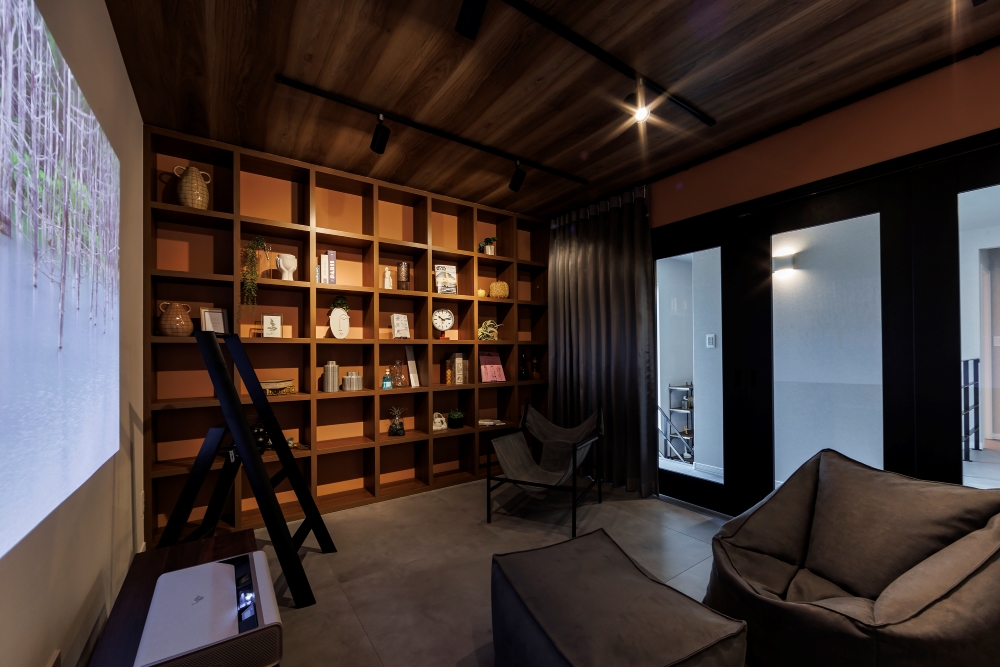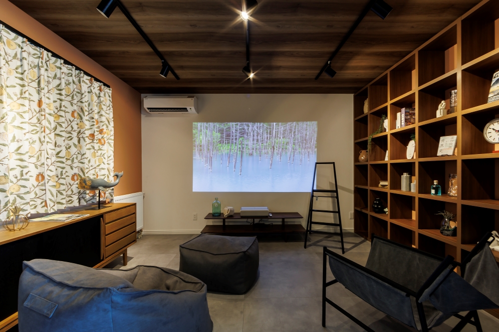 2階に上がった正面には、大きな本棚が魅力の洋室があり、セカンドリビングとして使用できます。正面の広い壁をスクリーンとして映画鑑賞をしたり、リラックスチェアやハンモックでゆったり読書を楽しめる至福の空間です。