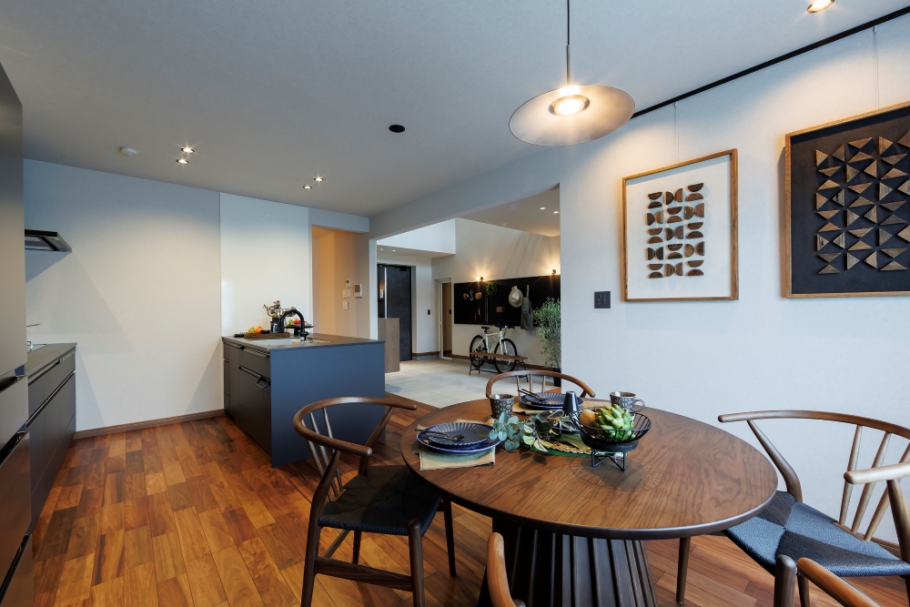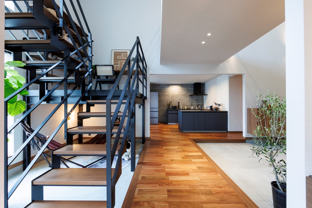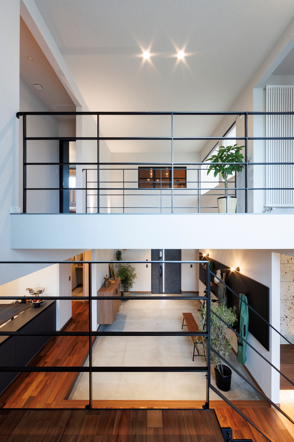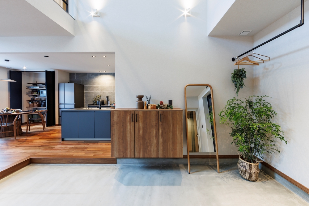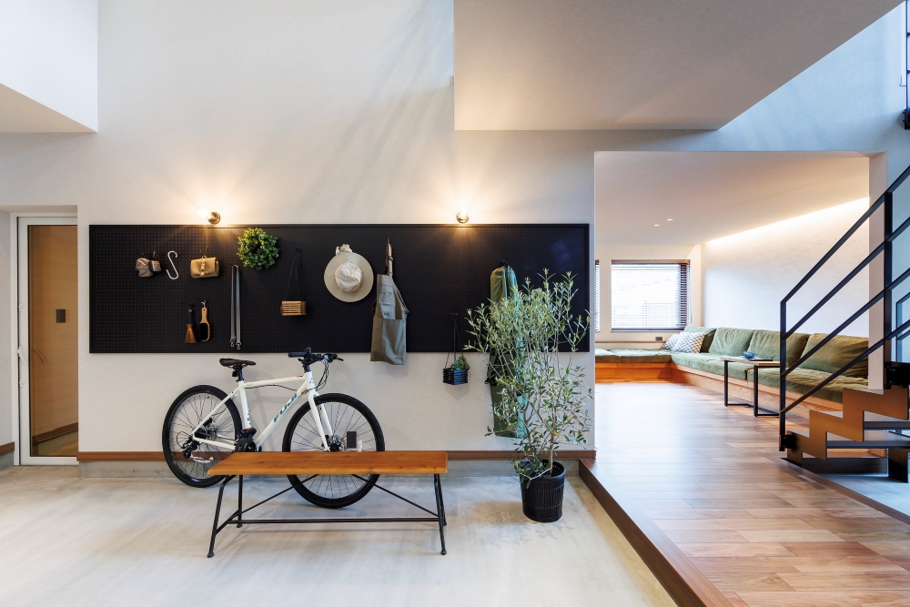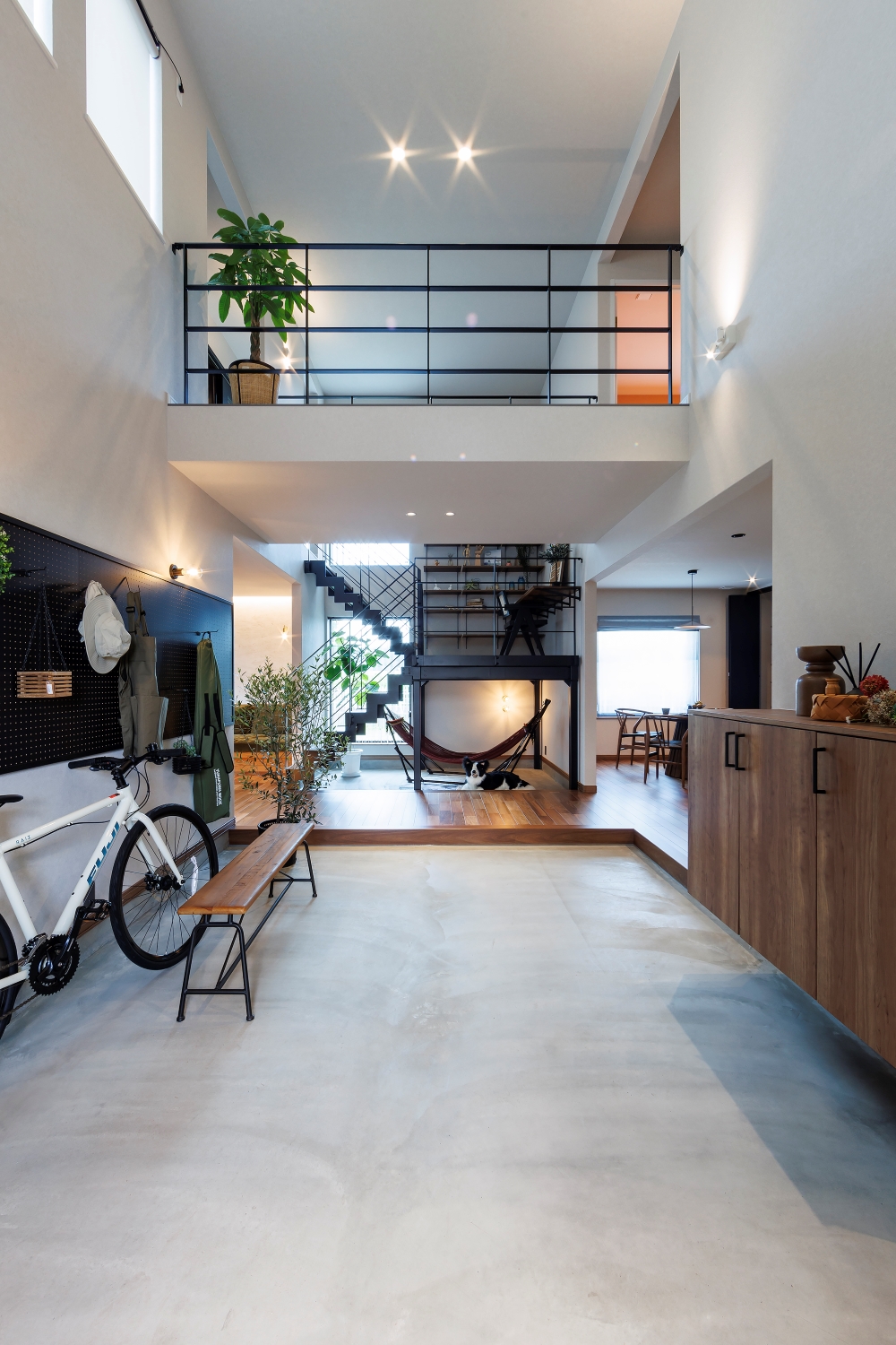 玄関を開けると、大迫力の土間スペースが広がり、開放感あふれる空間が迎えます。さらに、室内とつながったビルトインガレージは、雪の日も濡れることなく出入りでき、バイクや車のメンテナンスも心ゆくまで楽しめます。