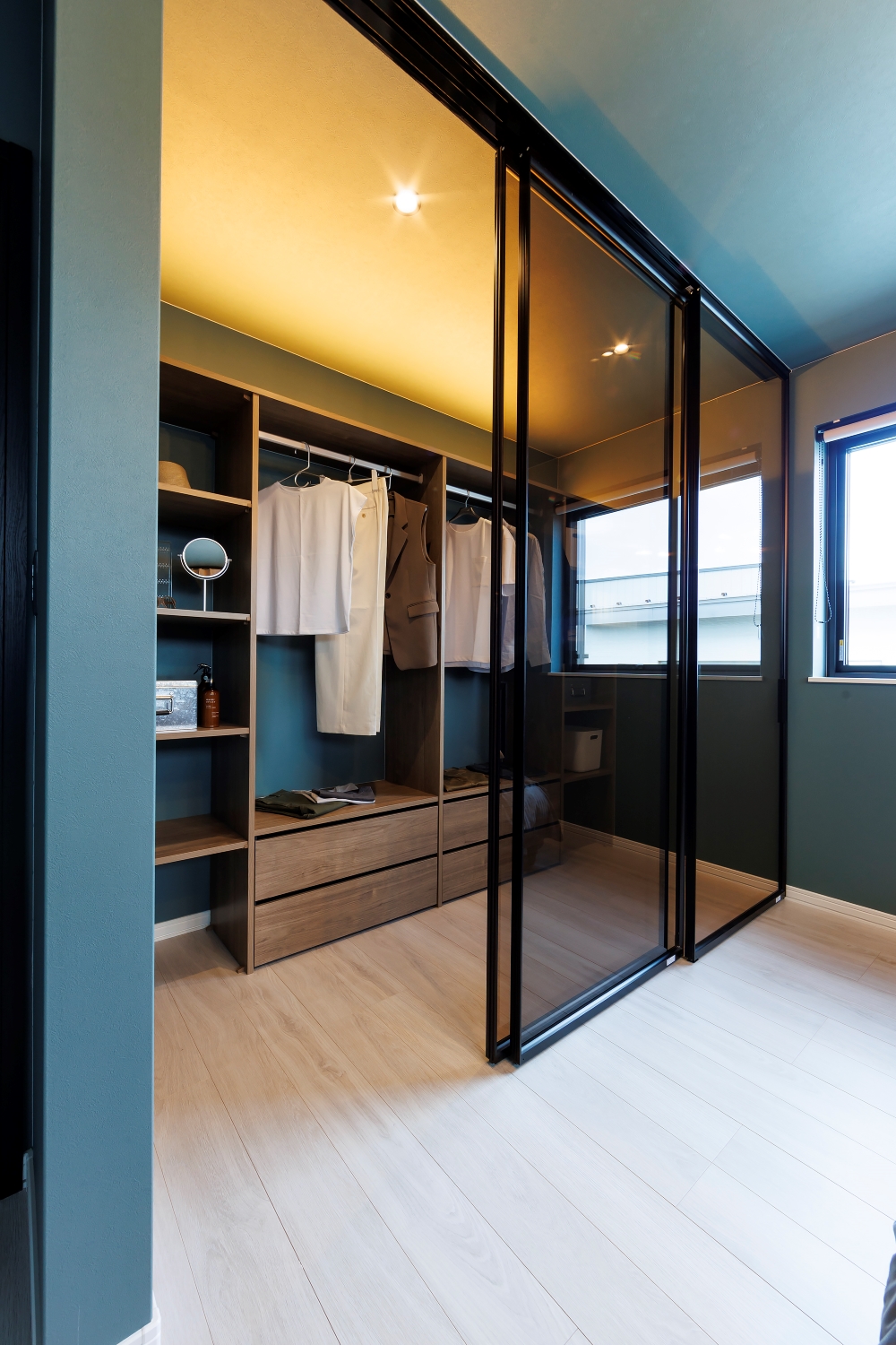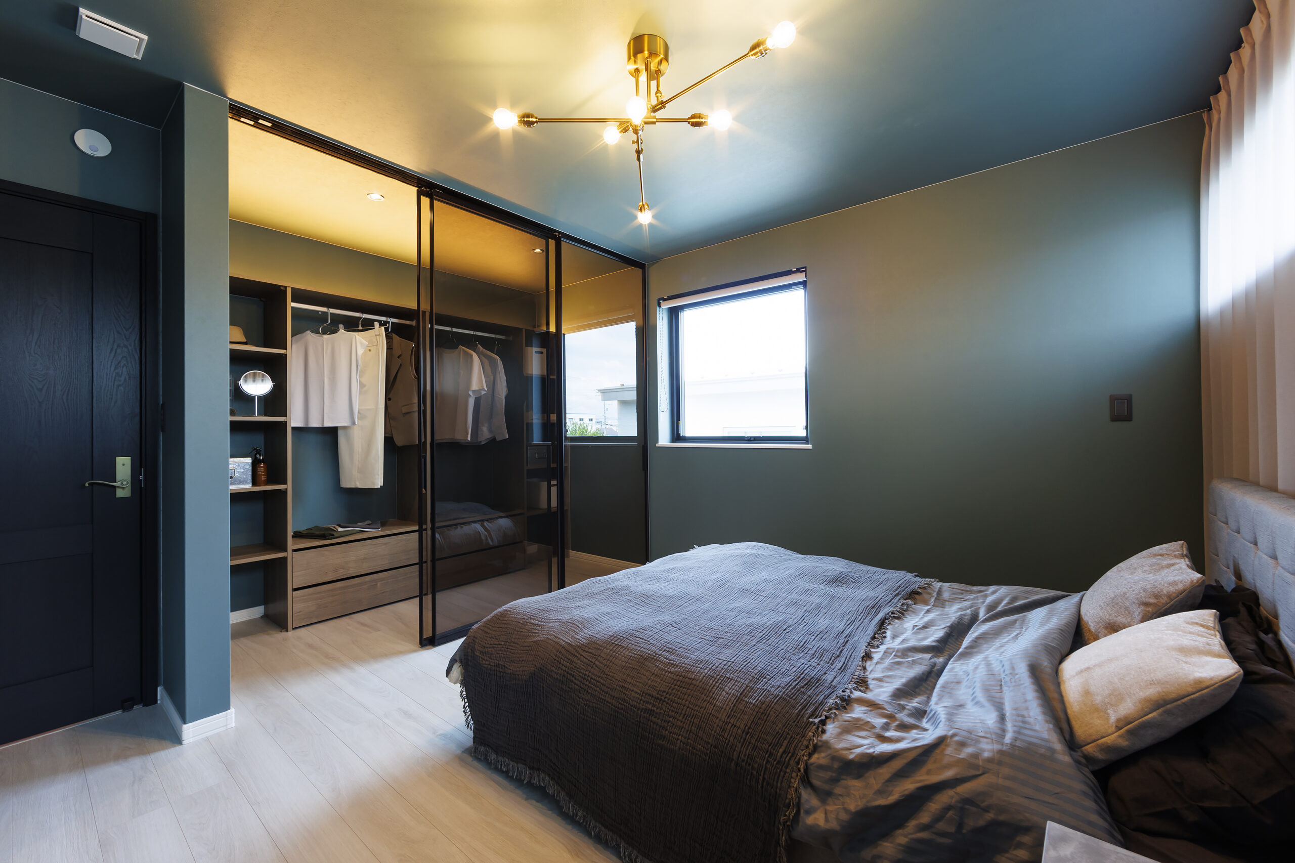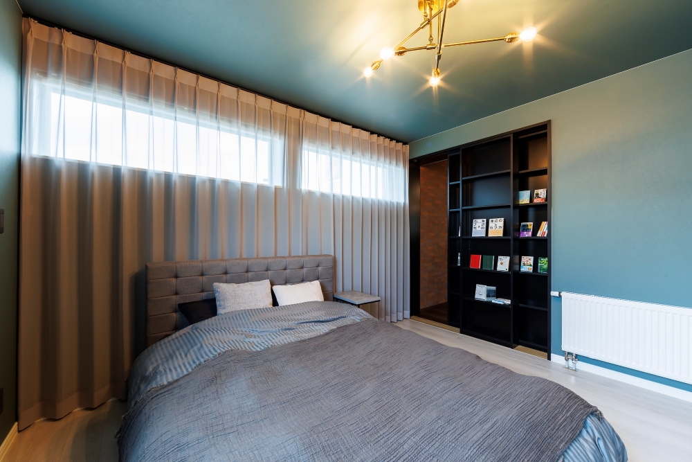 ホテルライクな主寝室。本棚をスライドさせると、そこには秘密の隠し部屋が。ワインセラーと冷凍庫を完備し、夫婦だけの大人の時間を楽しむことができます。