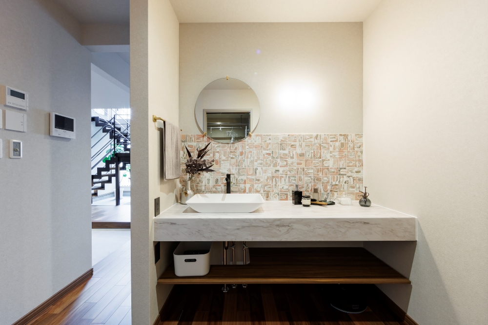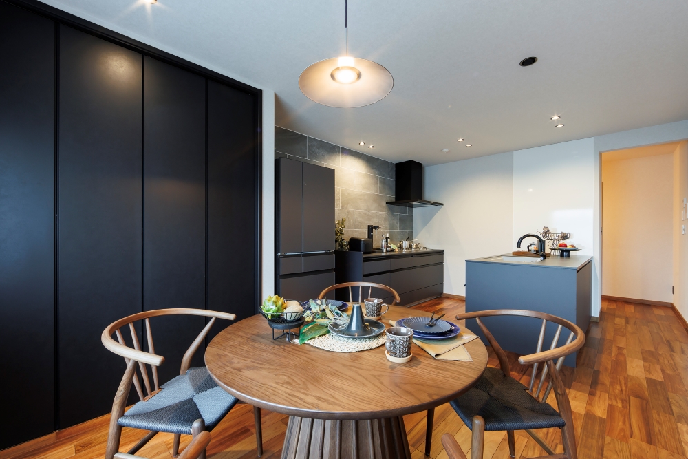 II型キッチンは、省スペースながらも作業面が広く取れる調理がしやすいレイアウト。シンクとコンロを向かい合わせに配置することで、無駄のない動きで家事が行えます。さらに、目隠し収納が生活感を抑え、スッキリとした印象を保てます。