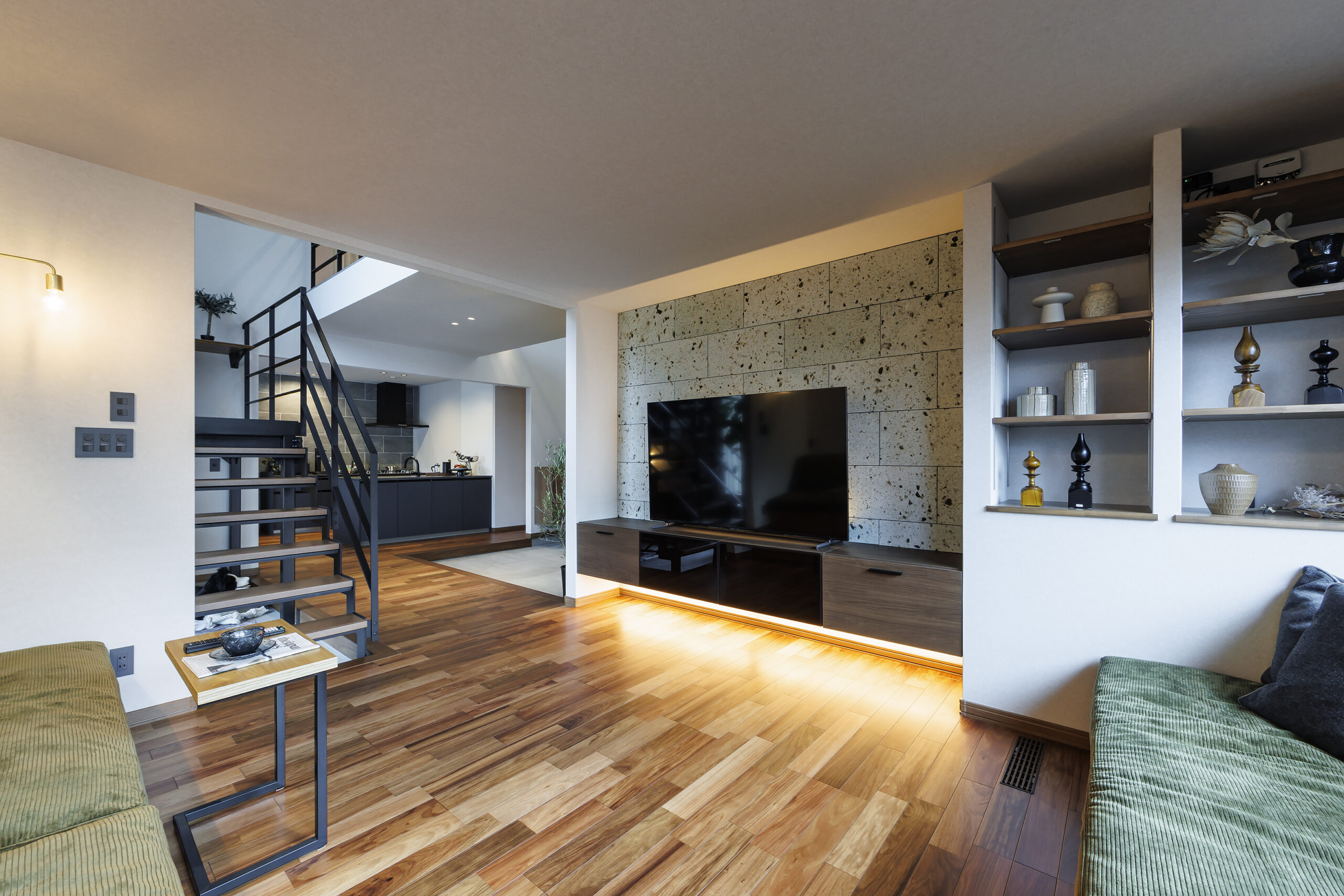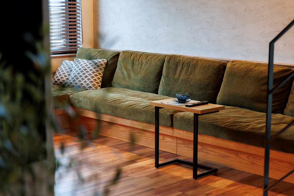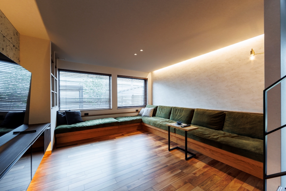 リビングの壁面はすべてソファで囲まれ、家族全員がゆったりと集えるラウンジスタイルに。