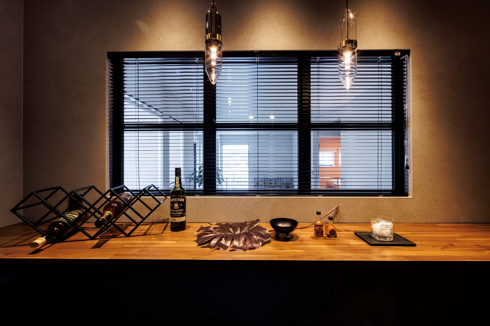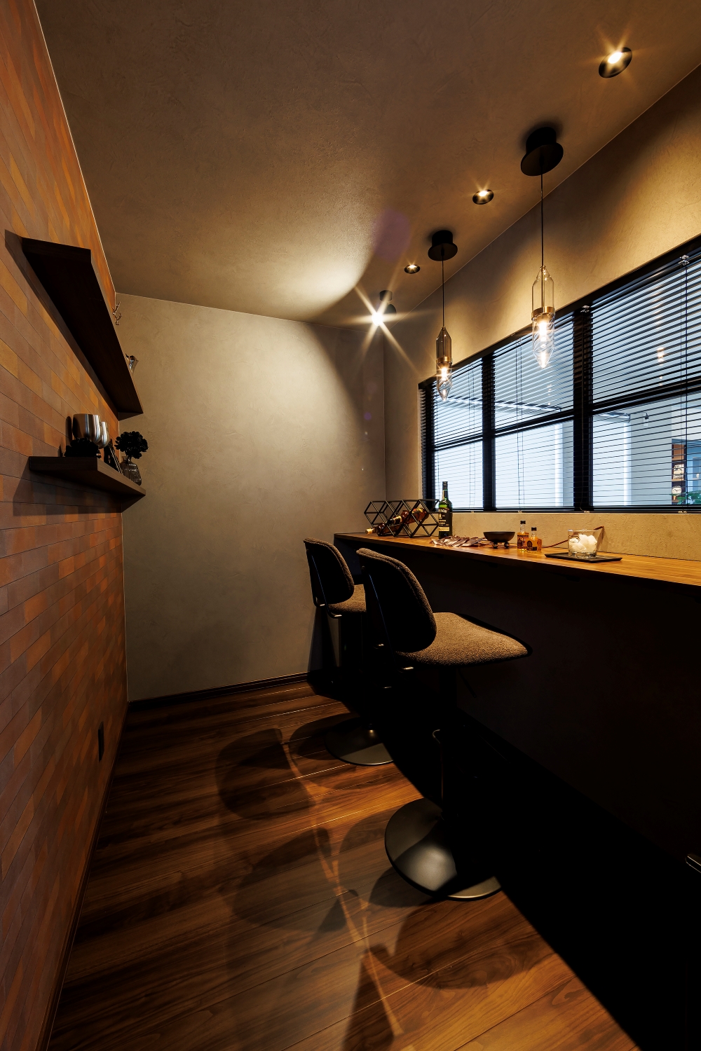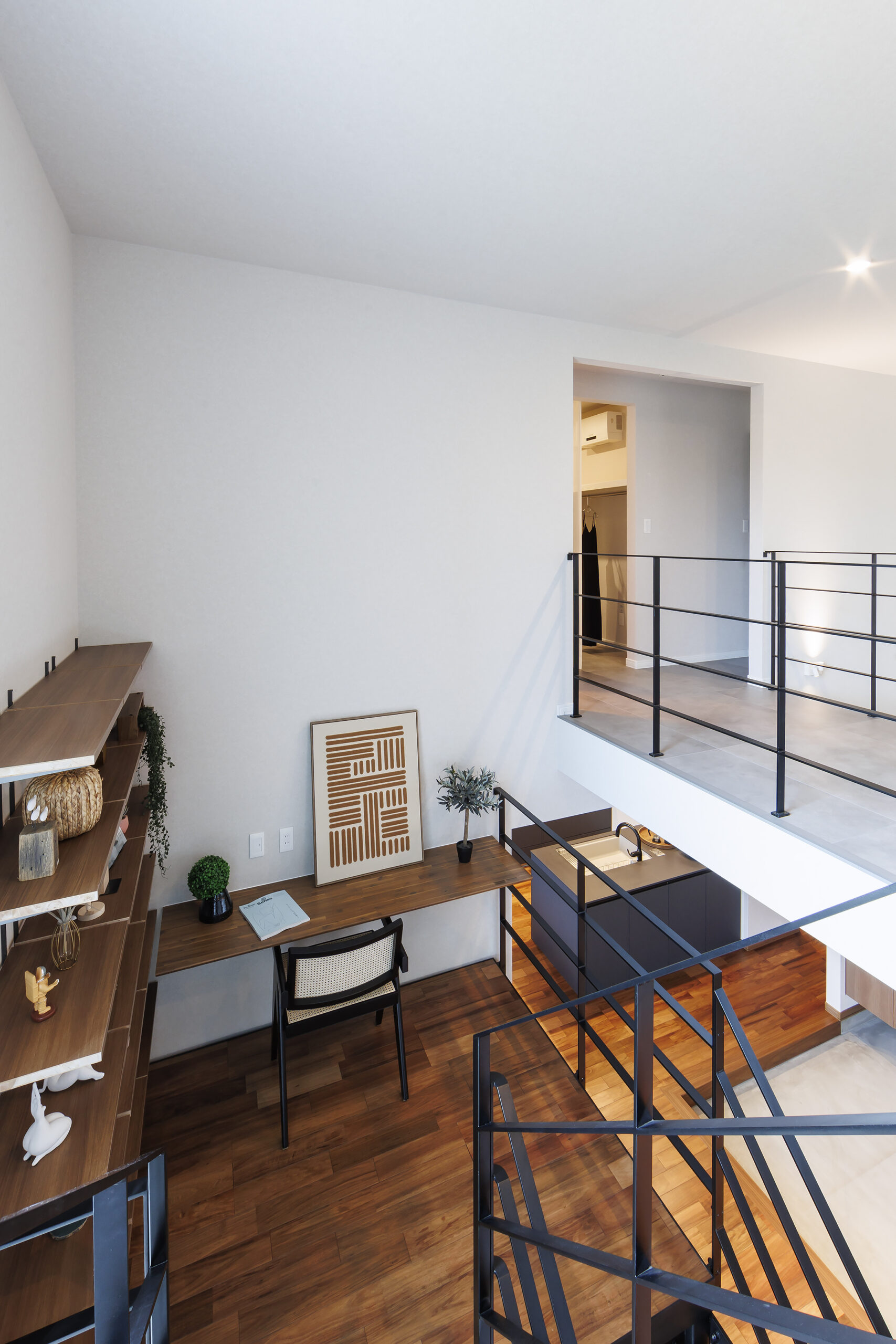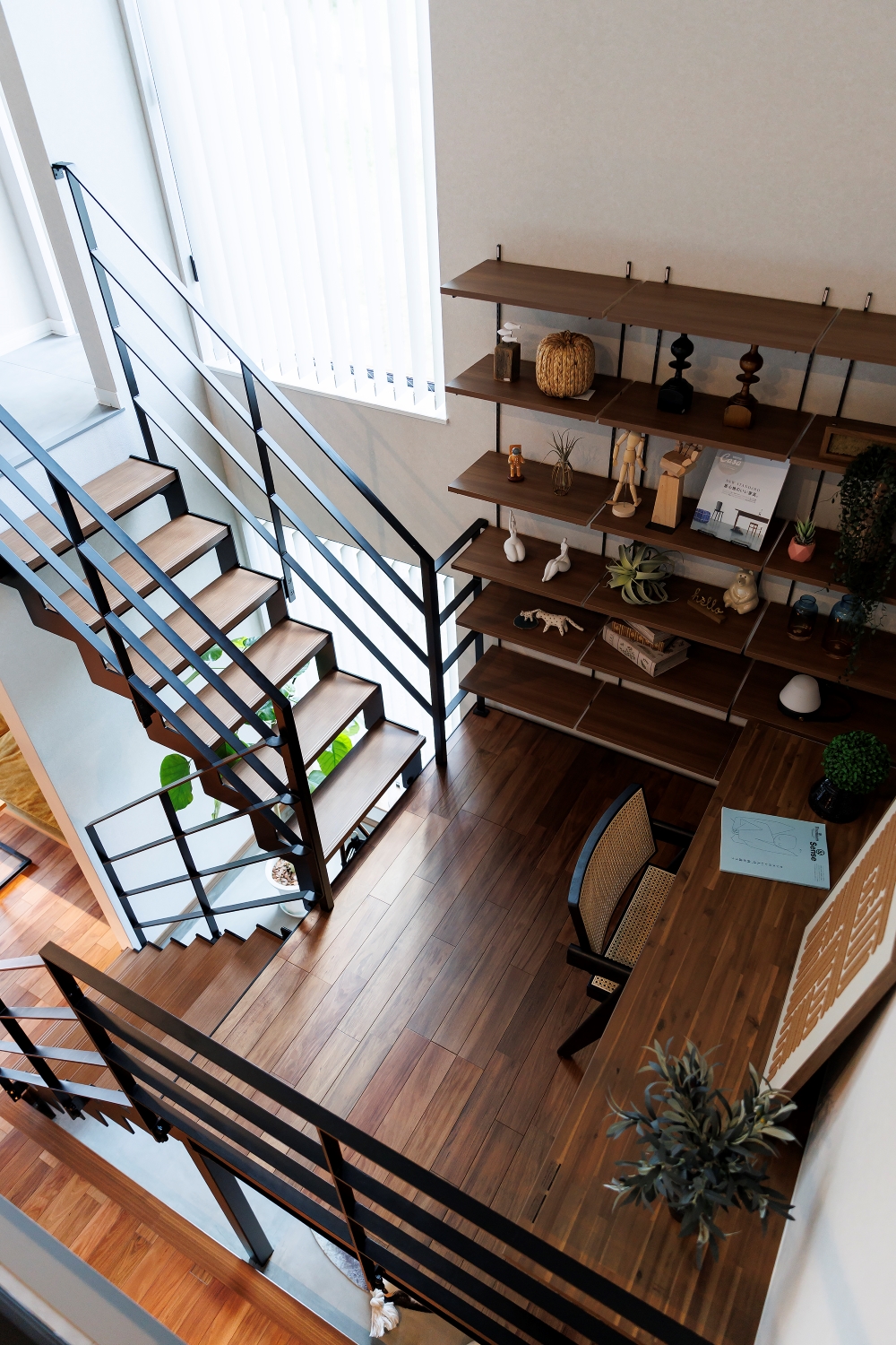 直線的で美しいデザインの階段途中には、造作カウンターと棚を設けました。趣味や仕事、勉強に使えるワークスペースとして活躍し、家族の気配を感じながらも自分の時間に集中できる、ちょうどいい場所です。