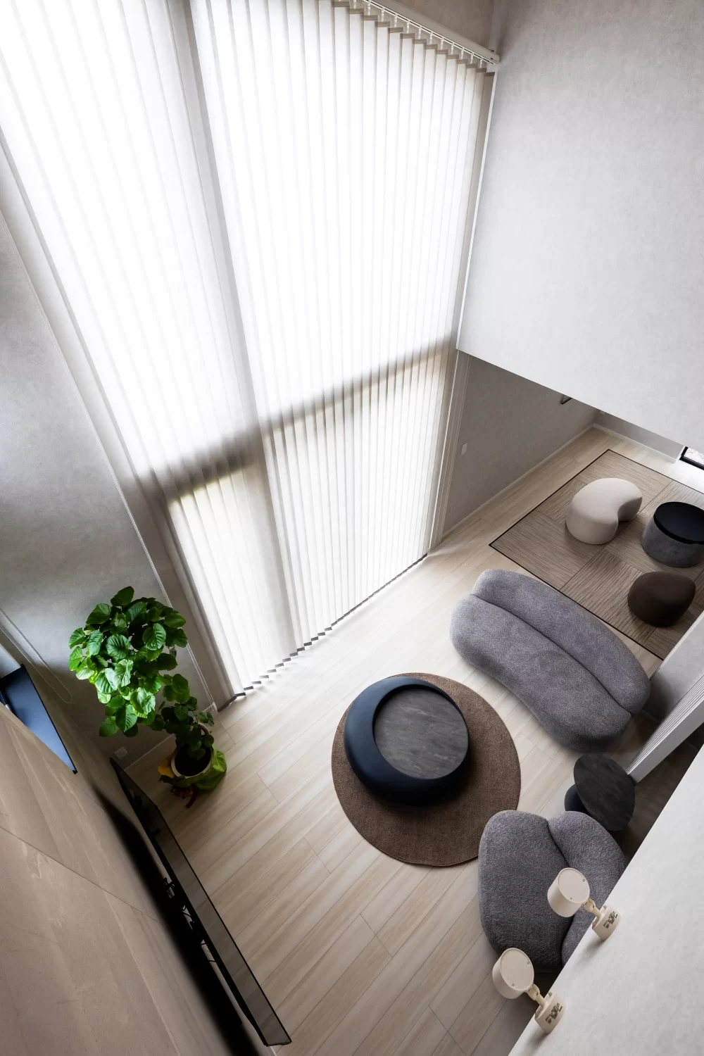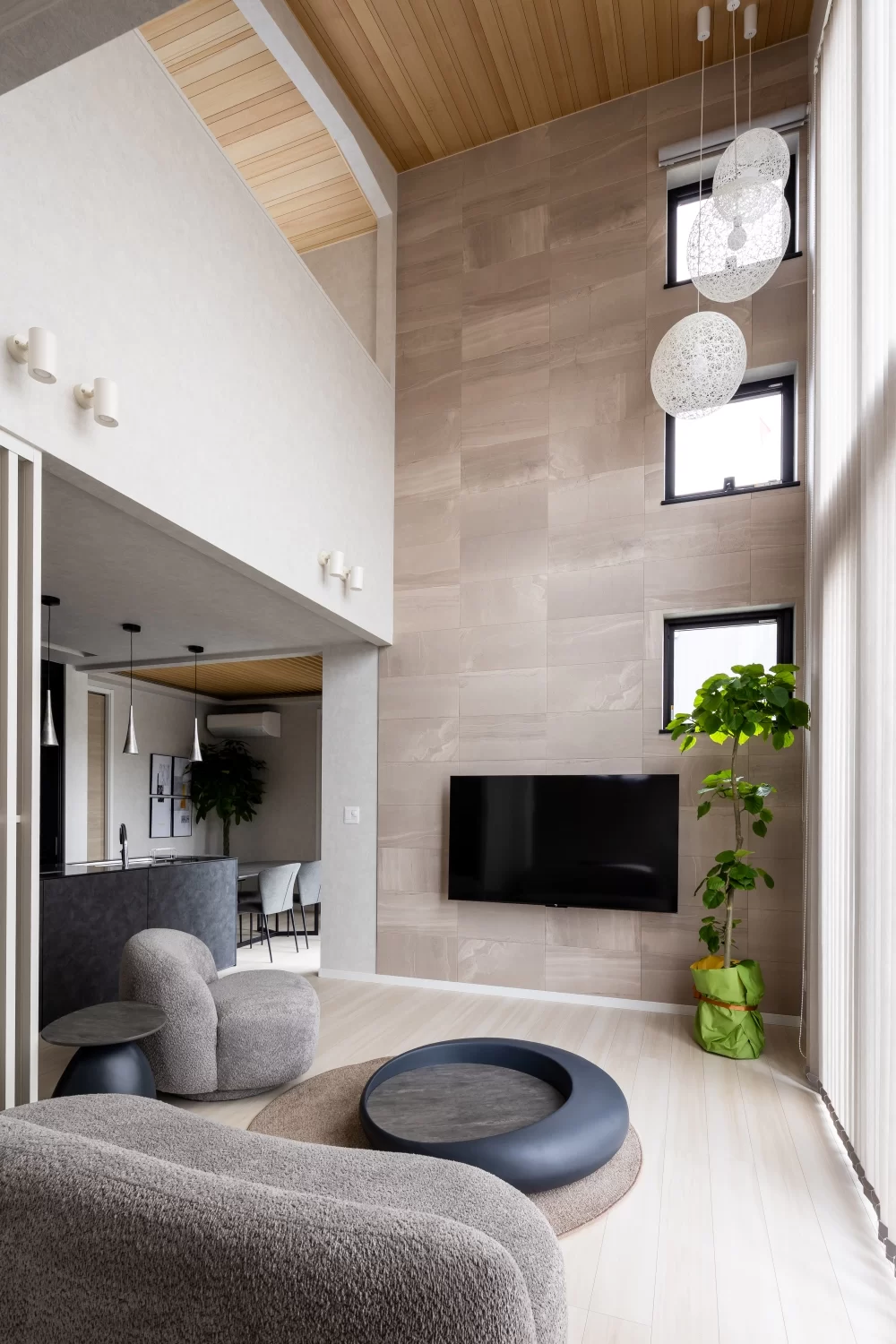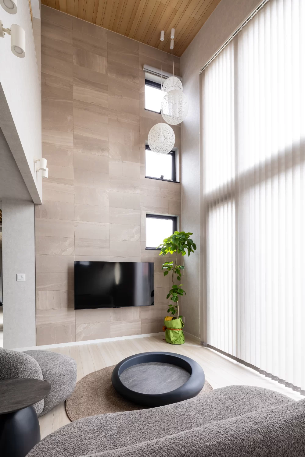 吹き抜けと壁一面の大きな窓から自然光が降り注ぐLDKは、明るさと開放感に満ちた心地よい空間に。家族が自然と集まり、穏やかな時間を過ごせます。