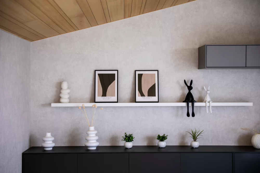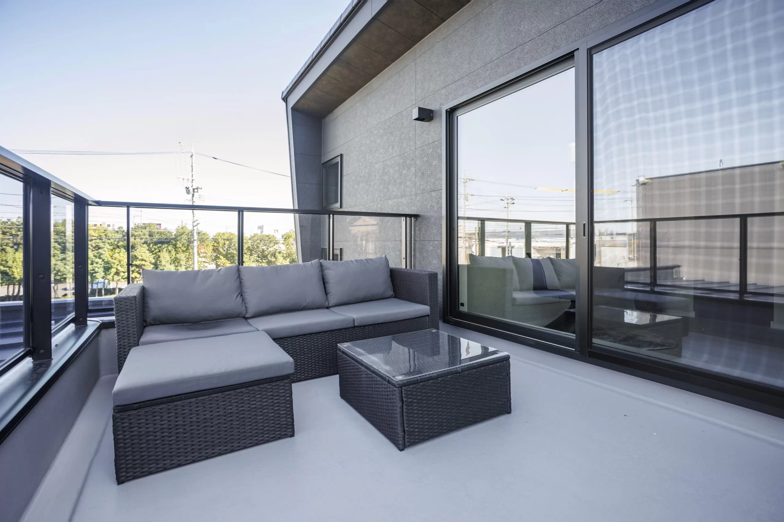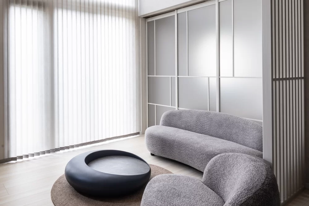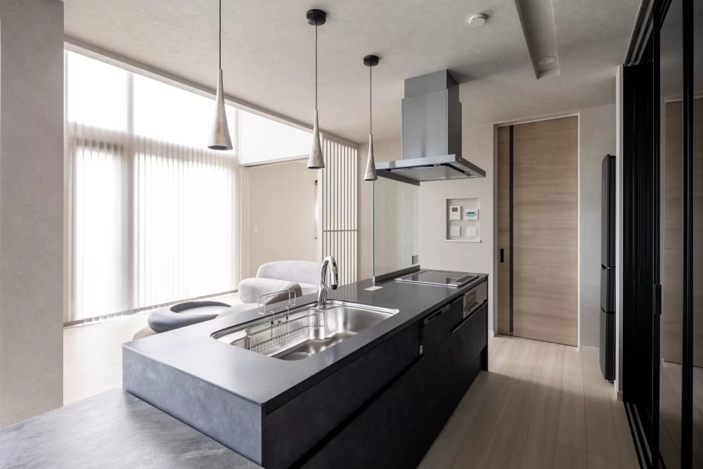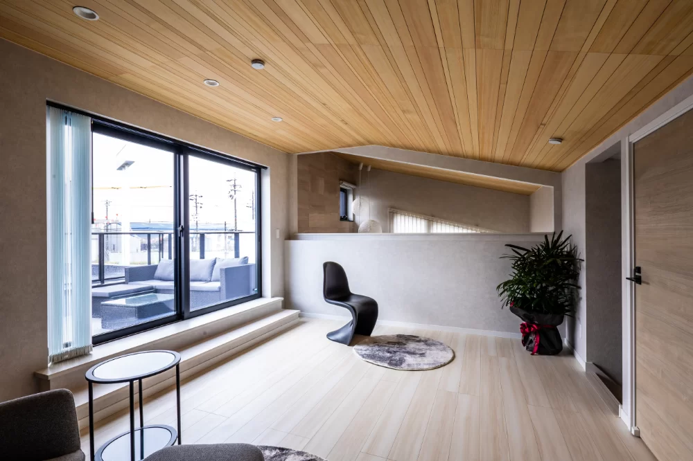 天井の高さが変化することで奥行きが生まれ、空間全体がゆったりとした雰囲気に。壁面には備え付け収納を設け、見た目もスッキリとスタイリッシュに整えています。さらに、隣接するバルコニーへそのまま出られるので、外のソファでまったり過ごす休日も楽しめます。