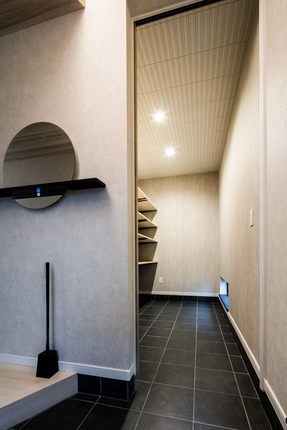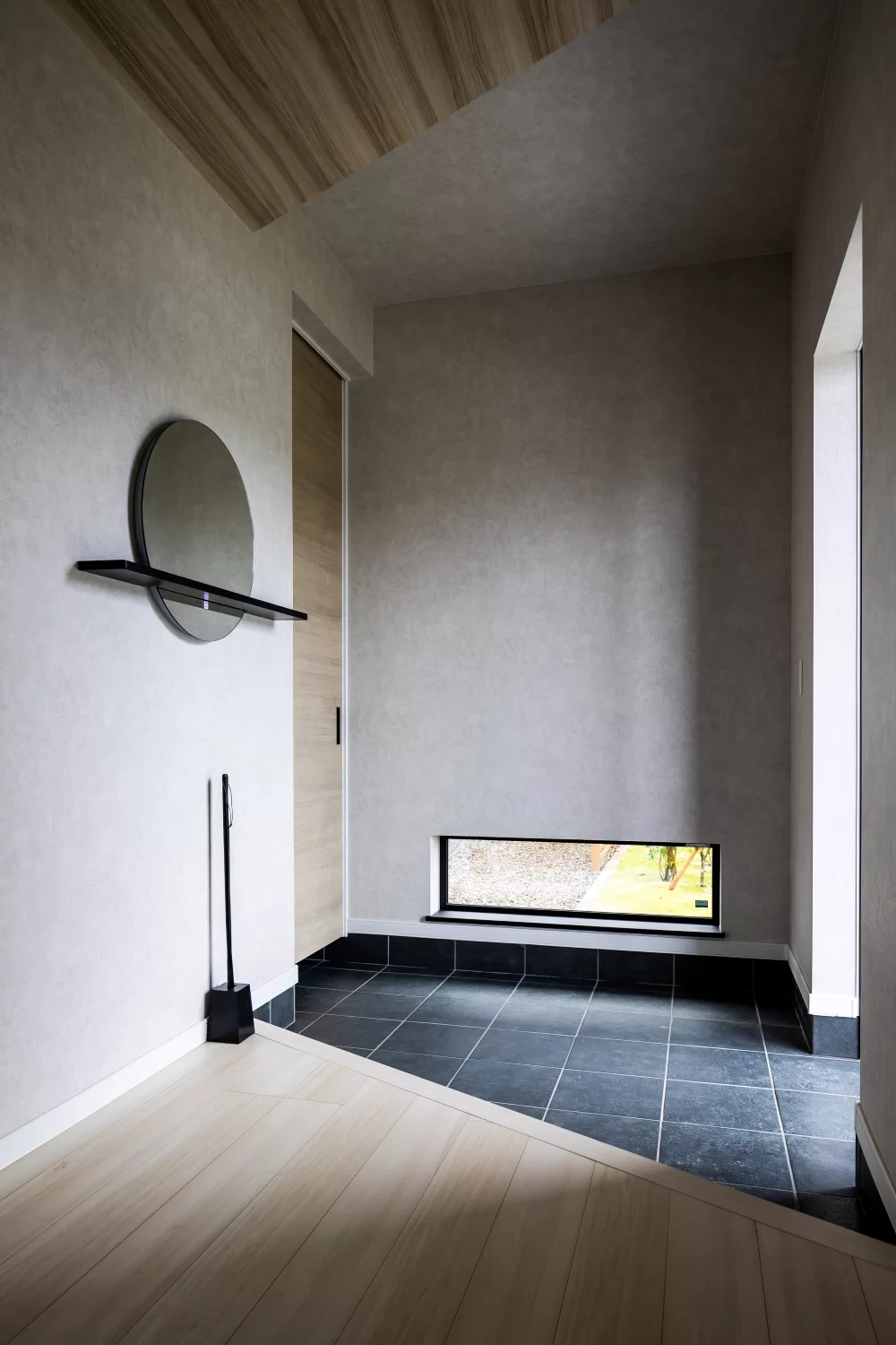 斜めの上がり框と下がり天井がデザインのアクセントの玄関。足元の窓が明るさを添え、ゆとりあるシューズクロークでいつでもすっきりと整う玄関です。