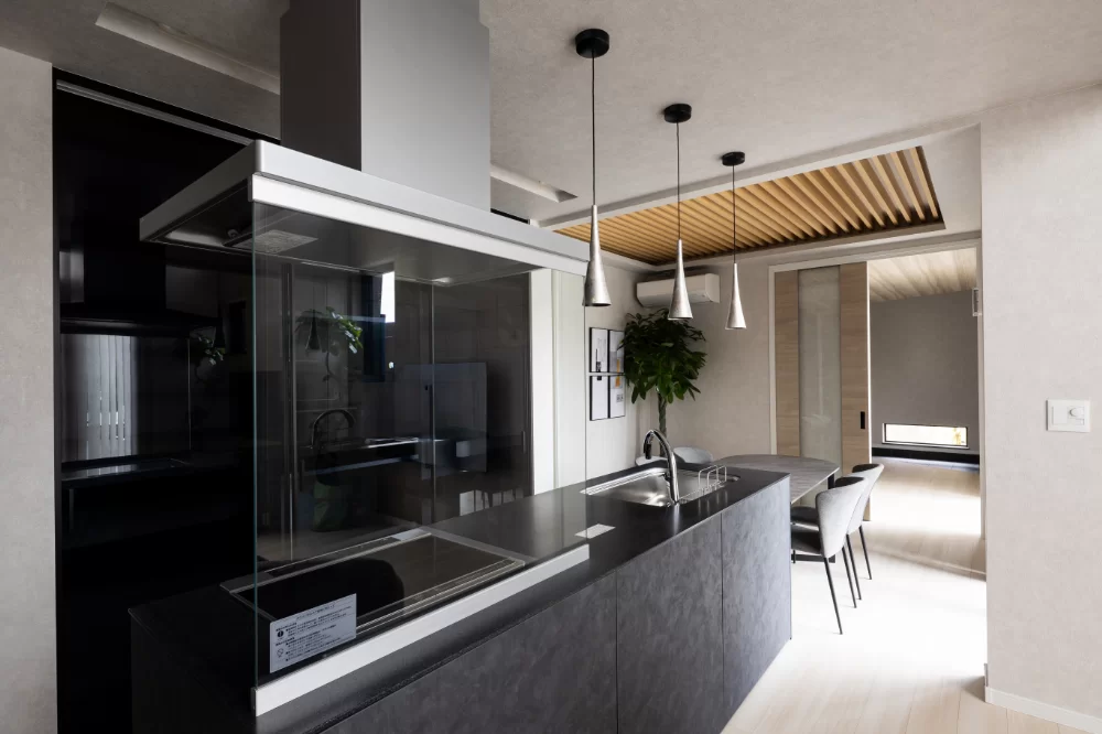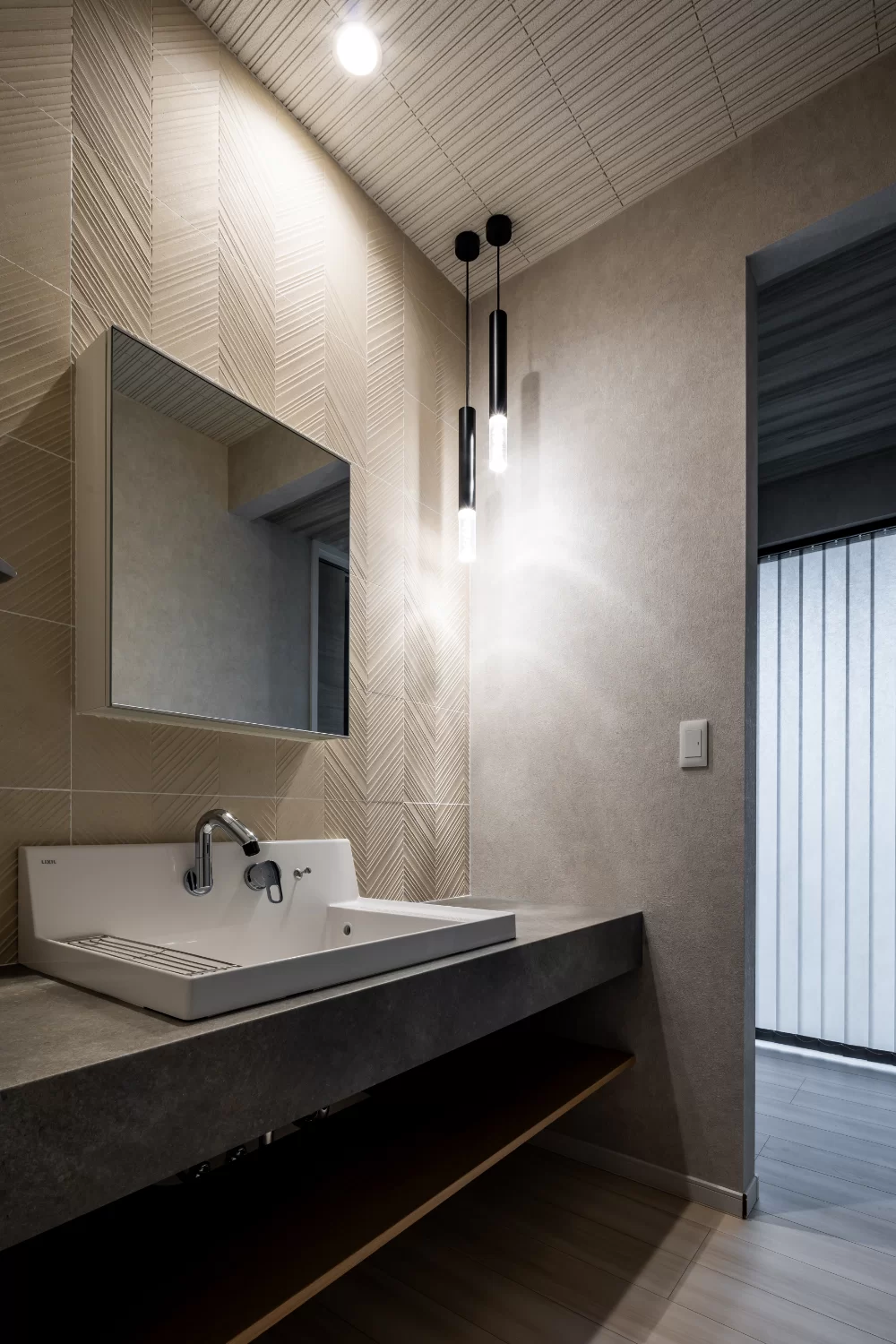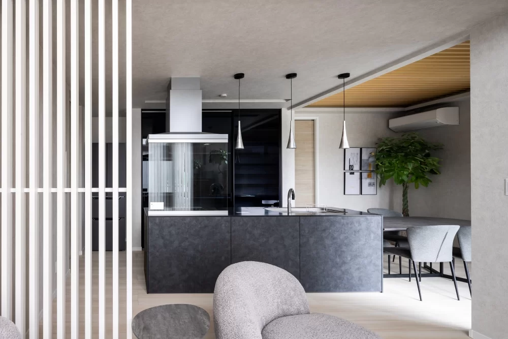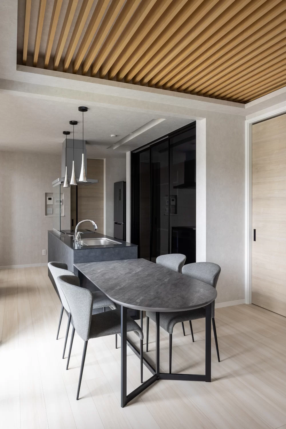 リビングとキッチンはスリット格子で緩やかに仕切られ、家族の気配を感じながら過ごせる心地よい設計に。1階は寝室・ウォークイン・ユーティリティが回遊動線でつながり、効率的で快適な暮らしを叶えます。