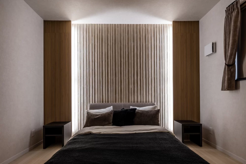 柔らかな間接照明が心地よく広がる寝室は、一日の疲れをしっかりと癒せる落ち着いた空間。