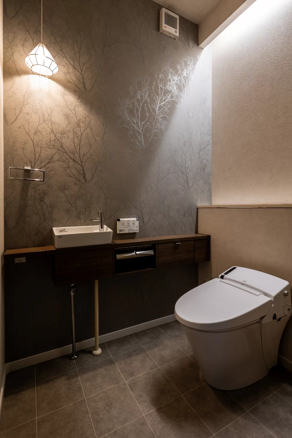 明るい畳が映える上品な和室。円窓や柔らかくアーチを描く垂れ壁が印象的で、現代的で洗練された雰囲気に仕上げています。階段下には床の間スペースがあり、物の整理や季節の花を飾るなど実用性も兼ね備えています。