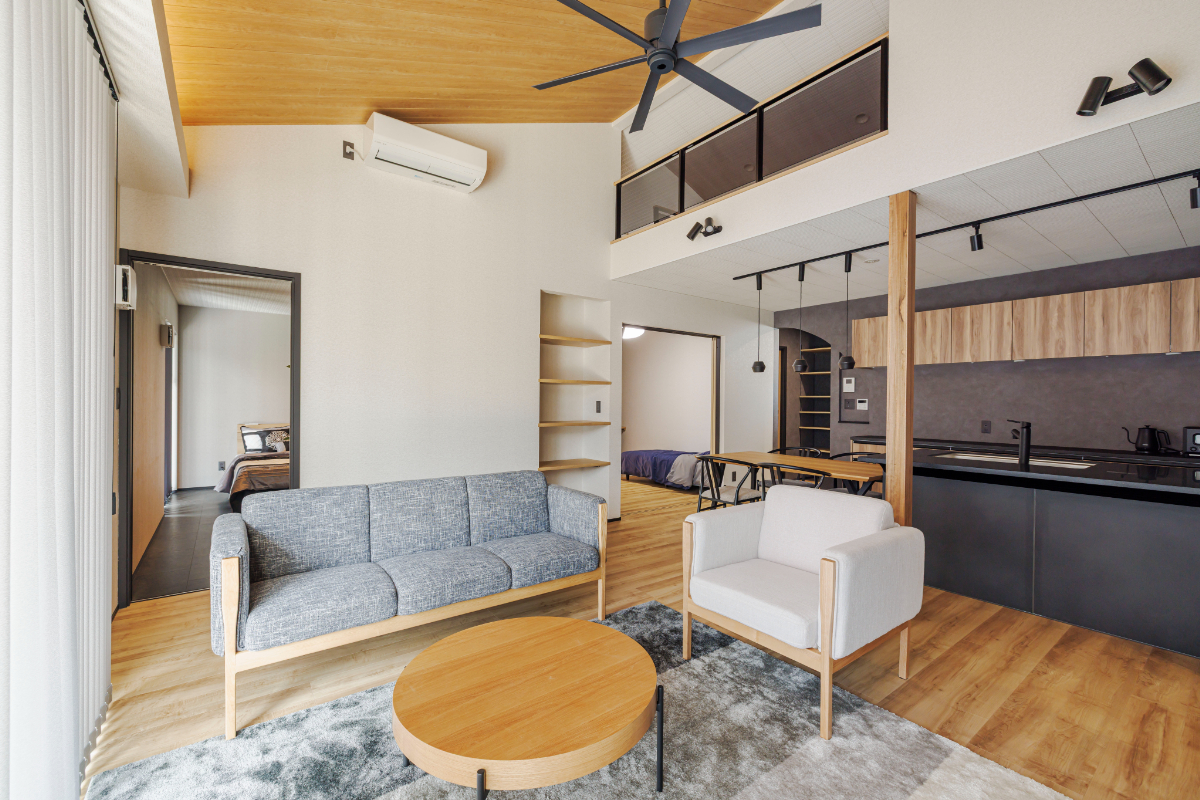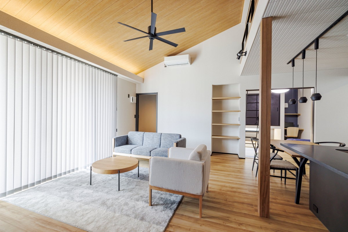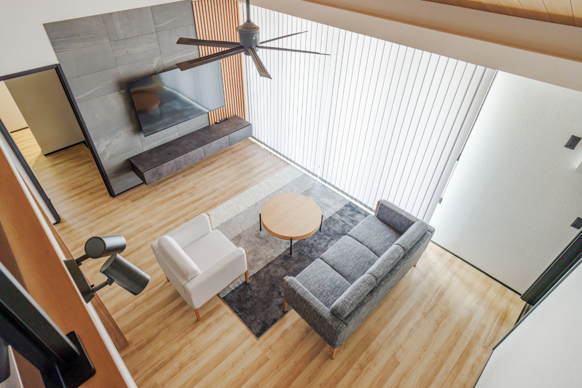 勾配天井が描き出す伸びやかな空間。広がりを感じるリビングは、家族が集う憩いの場としても、ゲストを迎えるおもてなしの場としても、特別なひとときを演出します。