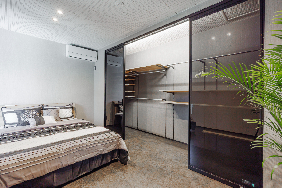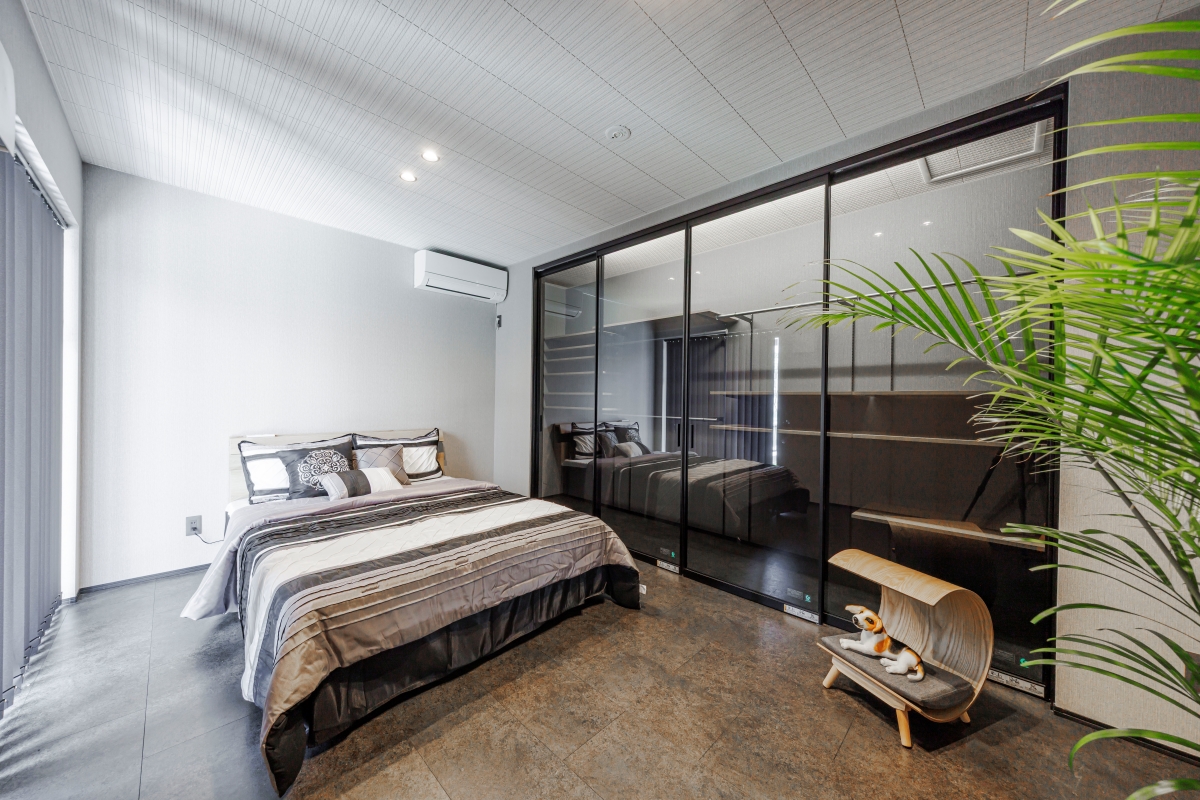 落ち着いた雰囲気の寝室からはテラスへ出られ、外の空気を感じながら心地よく過ごせます。ガラス扉の大きなクローゼットも備え、デザイン性と機能性を両立しました。