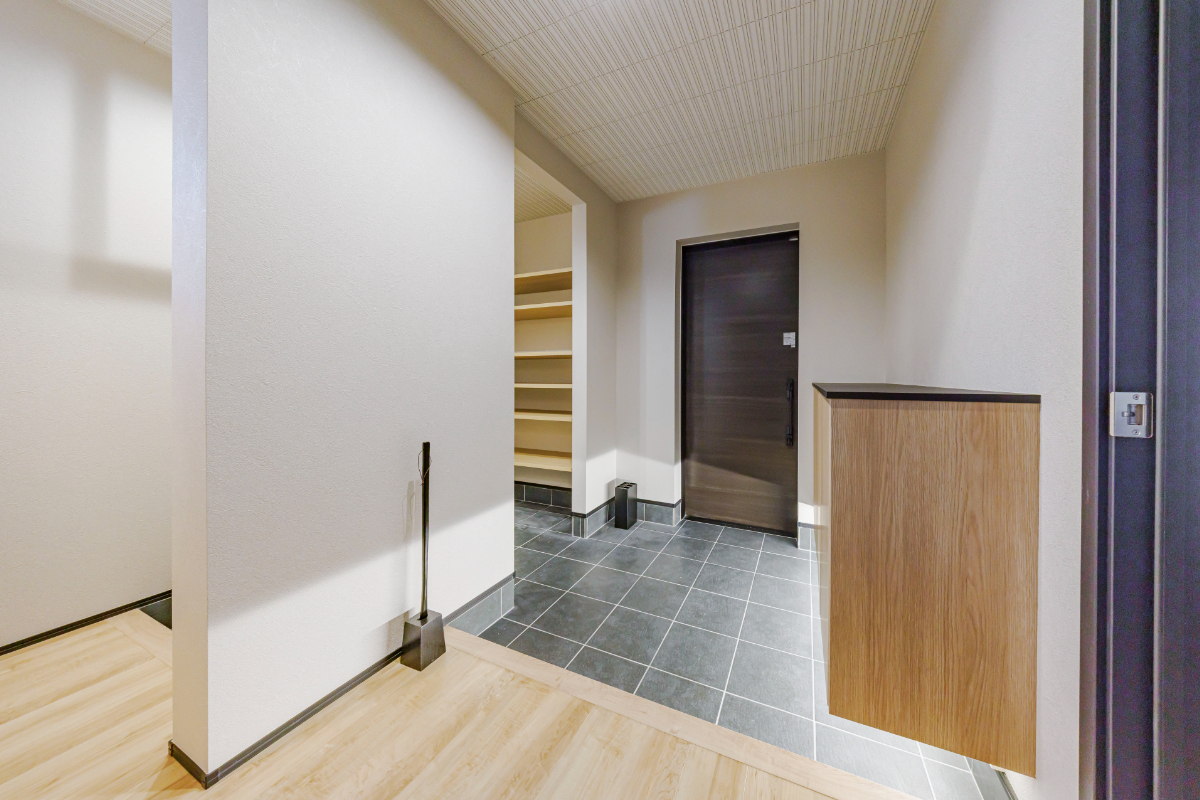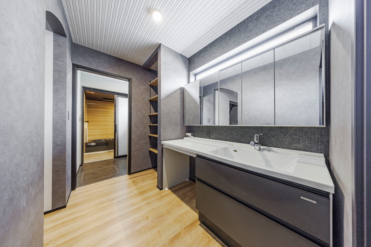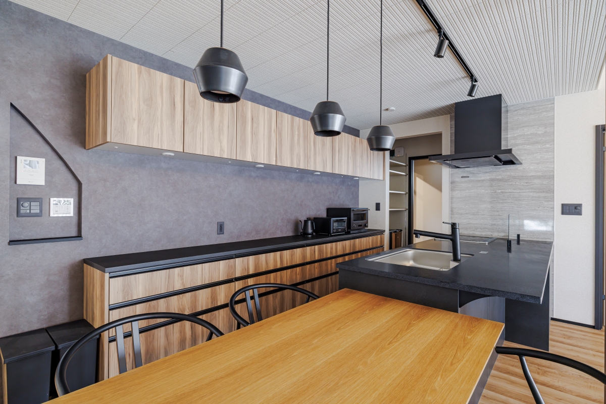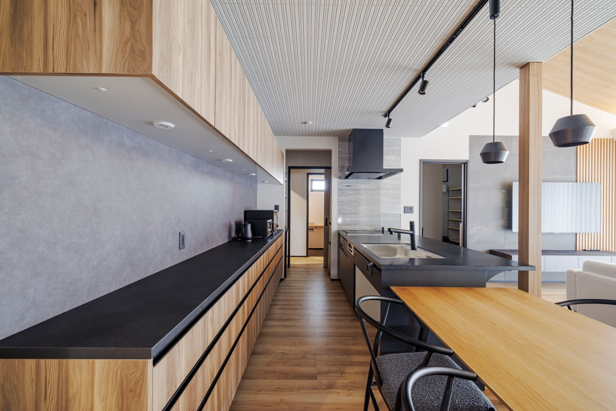 フルフラットのブラックキッチンは、大容量収納で料理も片付けも効率的に。横並びダイニングは配膳や片付けがしやすく、家事も家族の会話も自然につながります。さらに前面カウンターを備え、食事やお酒を楽しむひとときも豊かに演出します。