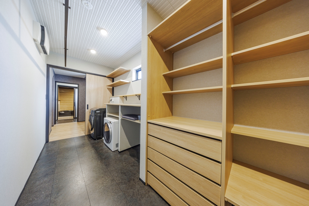 キッチンからパントリー、ファミリークローク、脱衣室、洗面所は行き止まりがなくひとつながりの空間としてアクセス可能。自由度の高い間取りと短い動線で毎日の家事がはかどります。共働きのご家庭や、のびのびとした子育てにもおすすめです。