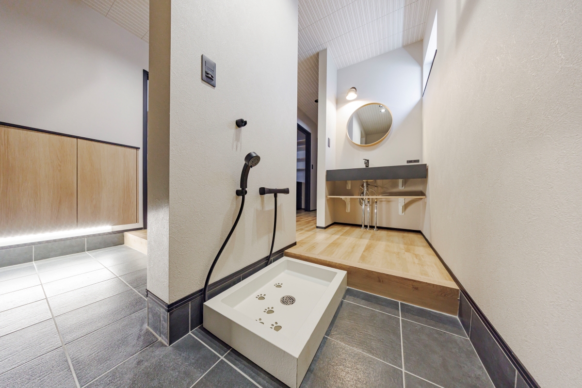 愛犬との楽しい暮らしにフォーカスした平屋です。ポイントは、お散歩・帰宅がスムーズで快適であること。足や腹下をサッと洗って室内に入れるよう、シューズクロークにシャワーをもうけています。汚れを室内に持ち込まない工夫や床材選びにこだわりました。