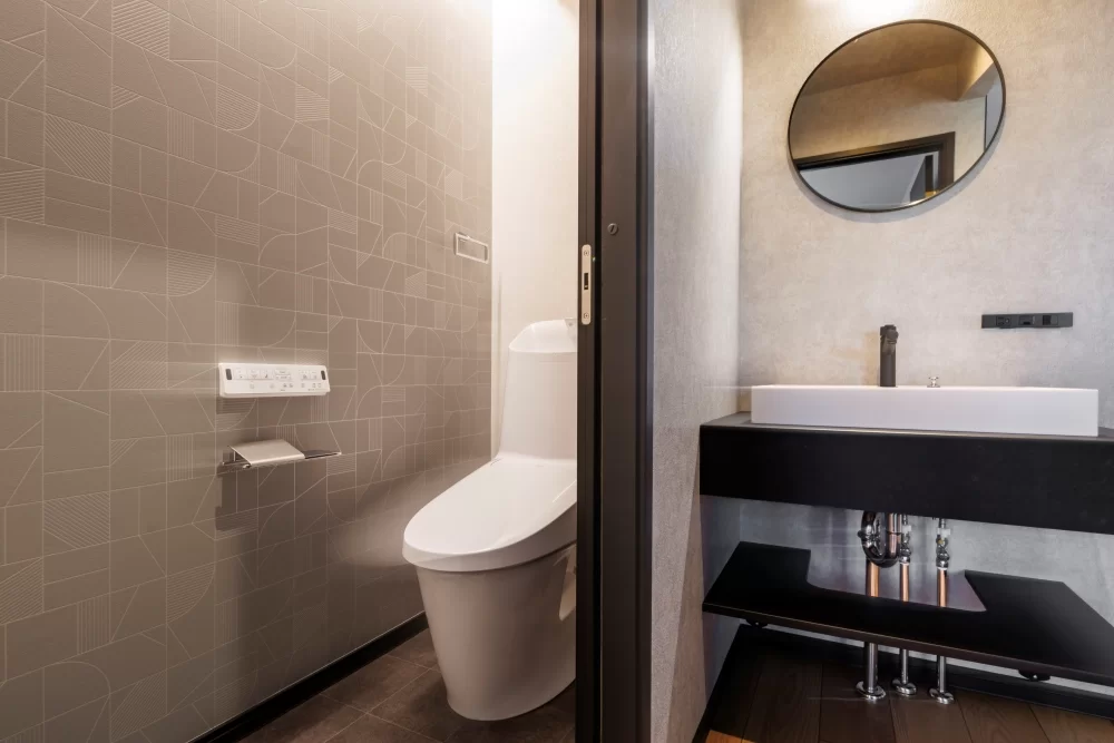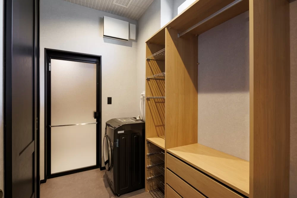 2つの洗面を備え、ブラックで統一されたスタイリッシュな空間は、朝の身支度を快適にサポートします。さらに、ユーティリティやトイレなどの水回りを集約し、家事動線にも配慮しました。