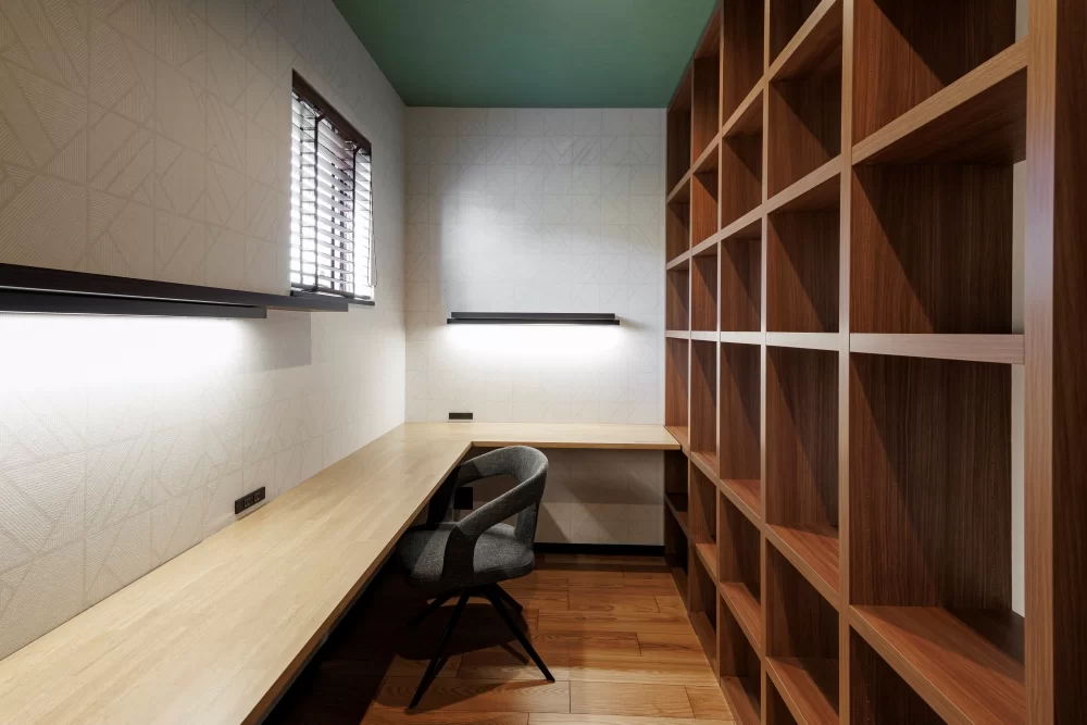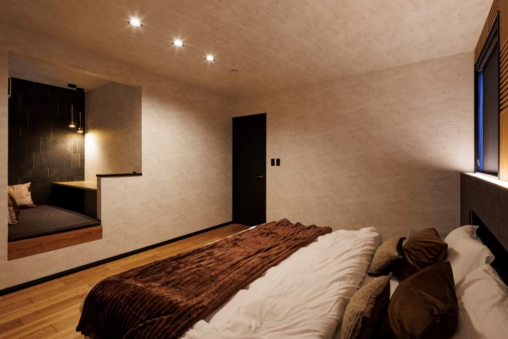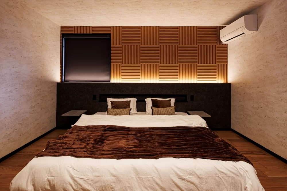 壁一面にあしらった飾り木目と、それをやさしく照らす間接照明が、落ち着きと上質感を両立させた贅沢な空間を演出します。ゆったりとした時間が流れる、大人のための特別な寝室です。