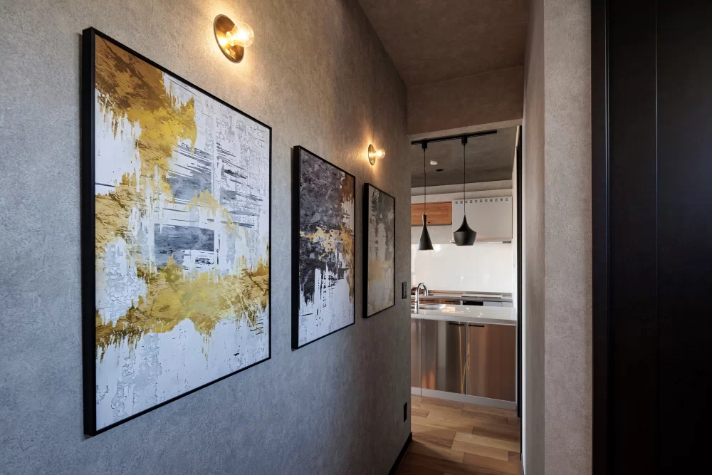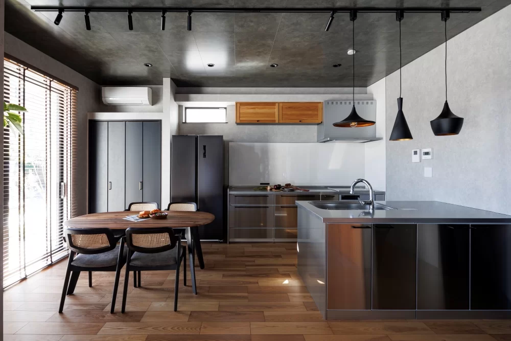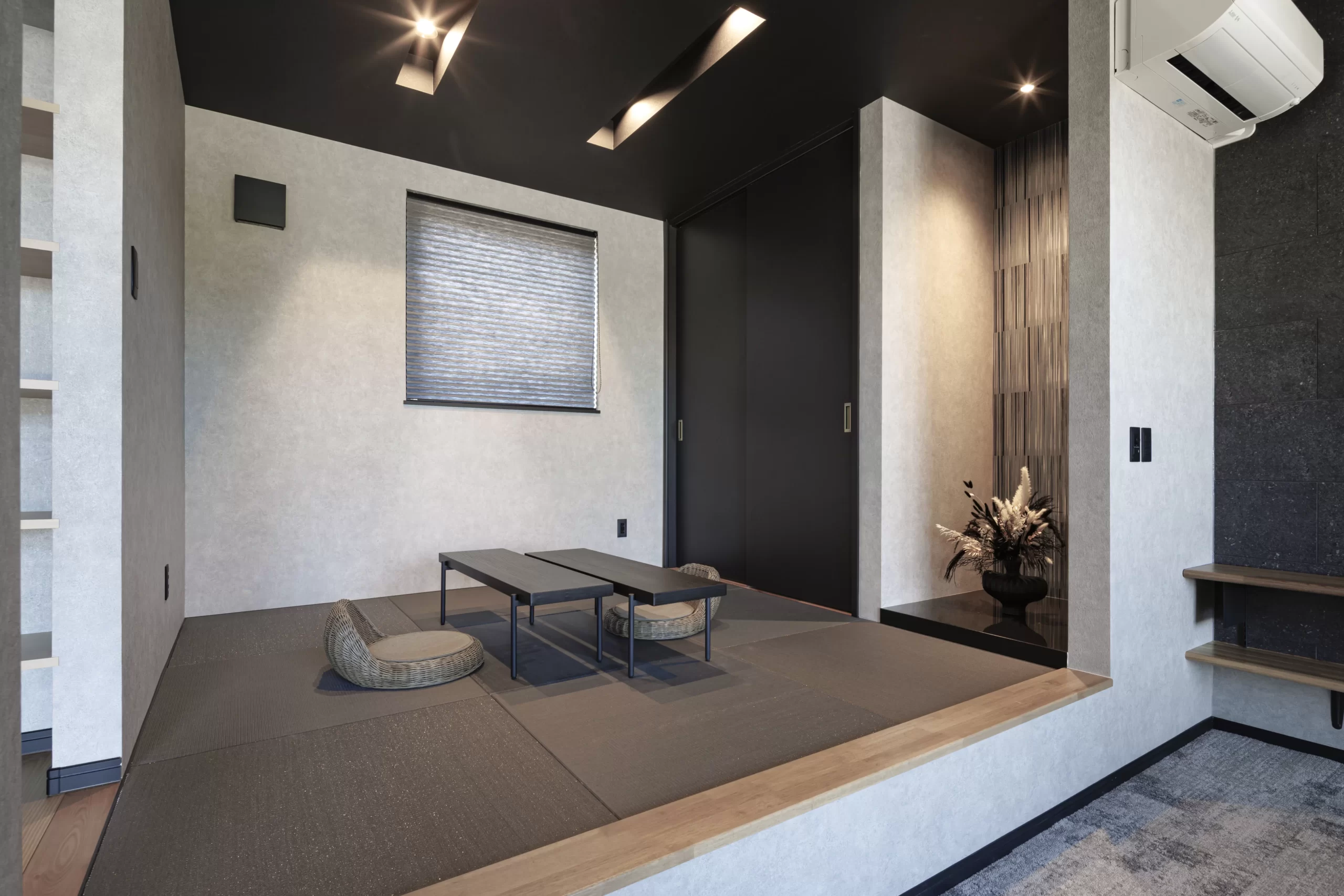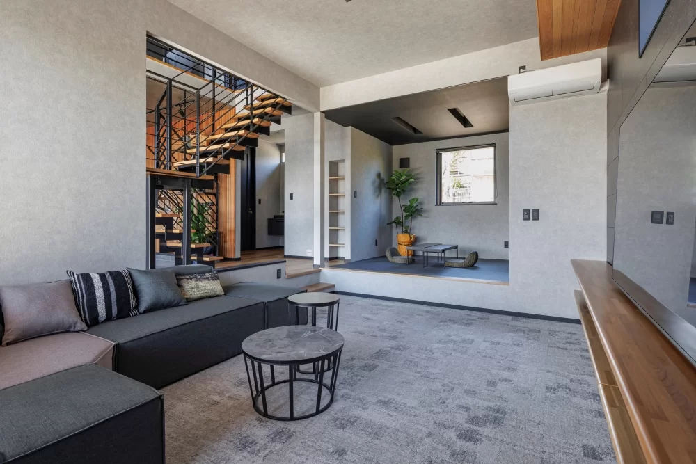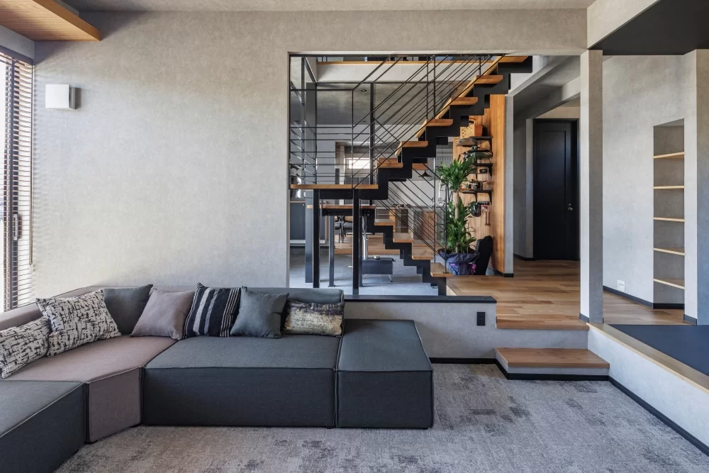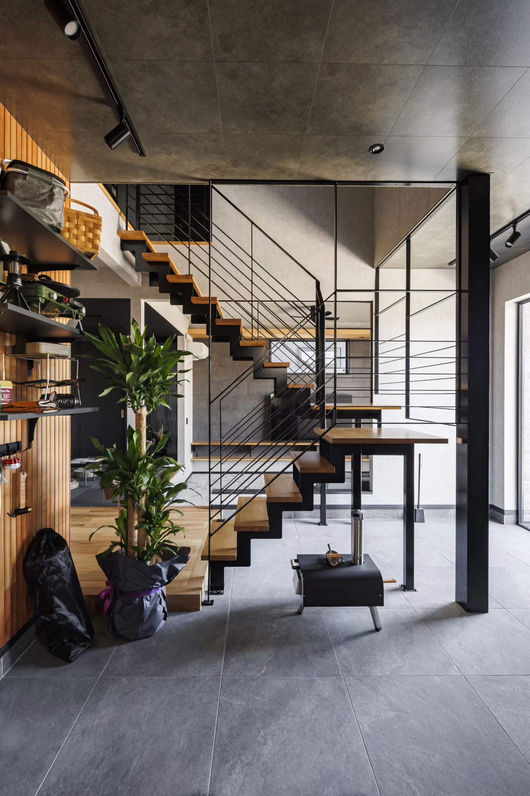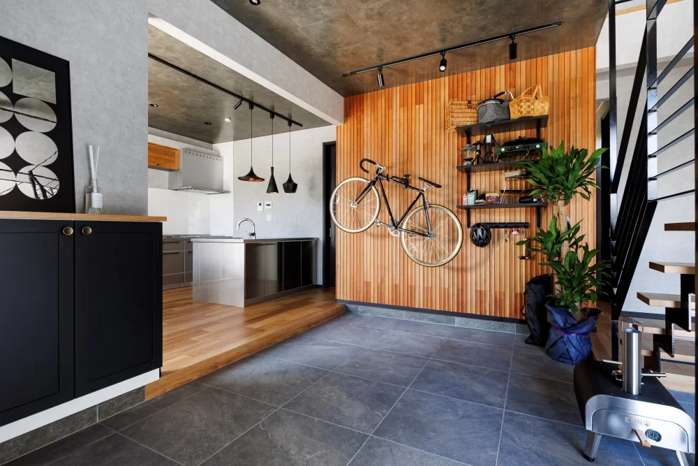 土間仕上げのエントランスは、趣味アイテムを“魅せる”収納として活躍。お気に入りをディスプレイしてゲストにお披露目したり、お手入れの時間を楽しめる、自慢のギャラリースペースです。 さらに、存在感のあるブラック鉄骨階段が空間を引き締め、印象的なアクセントを添えます。