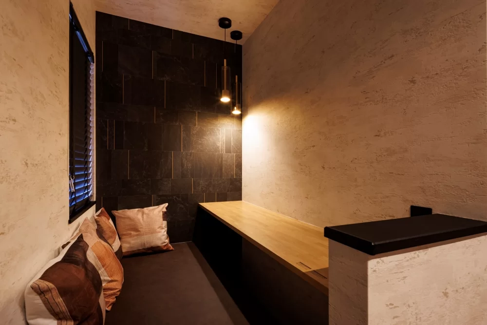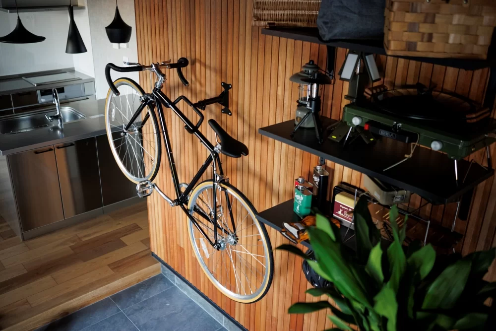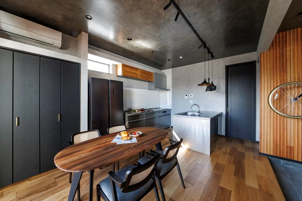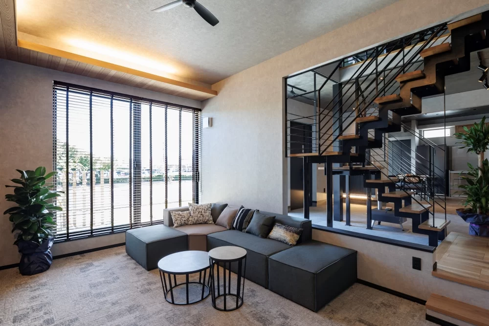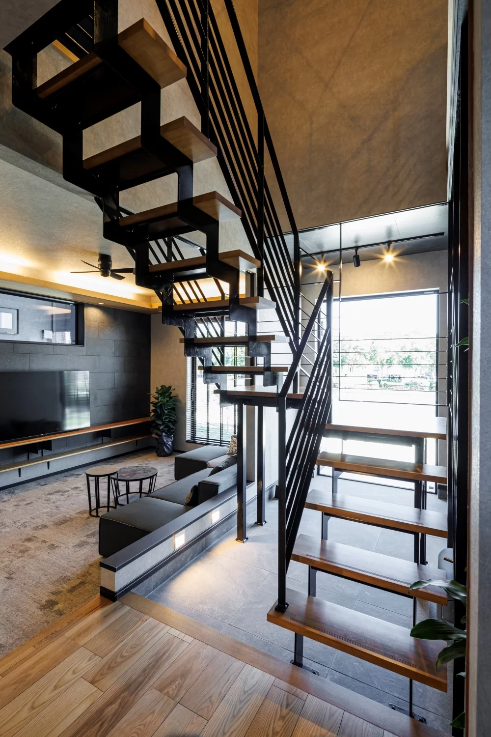 土間仕上げのエントランスは、趣味アイテムを“魅せる”収納として活躍。お気に入りをディスプレイしてゲストにお披露目したり、お手入れの時間を楽しめる、自慢のギャラリースペースです。 さらに、存在感のあるブラック鉄骨階段が空間を引き締め、印象的なアクセントを添えます。