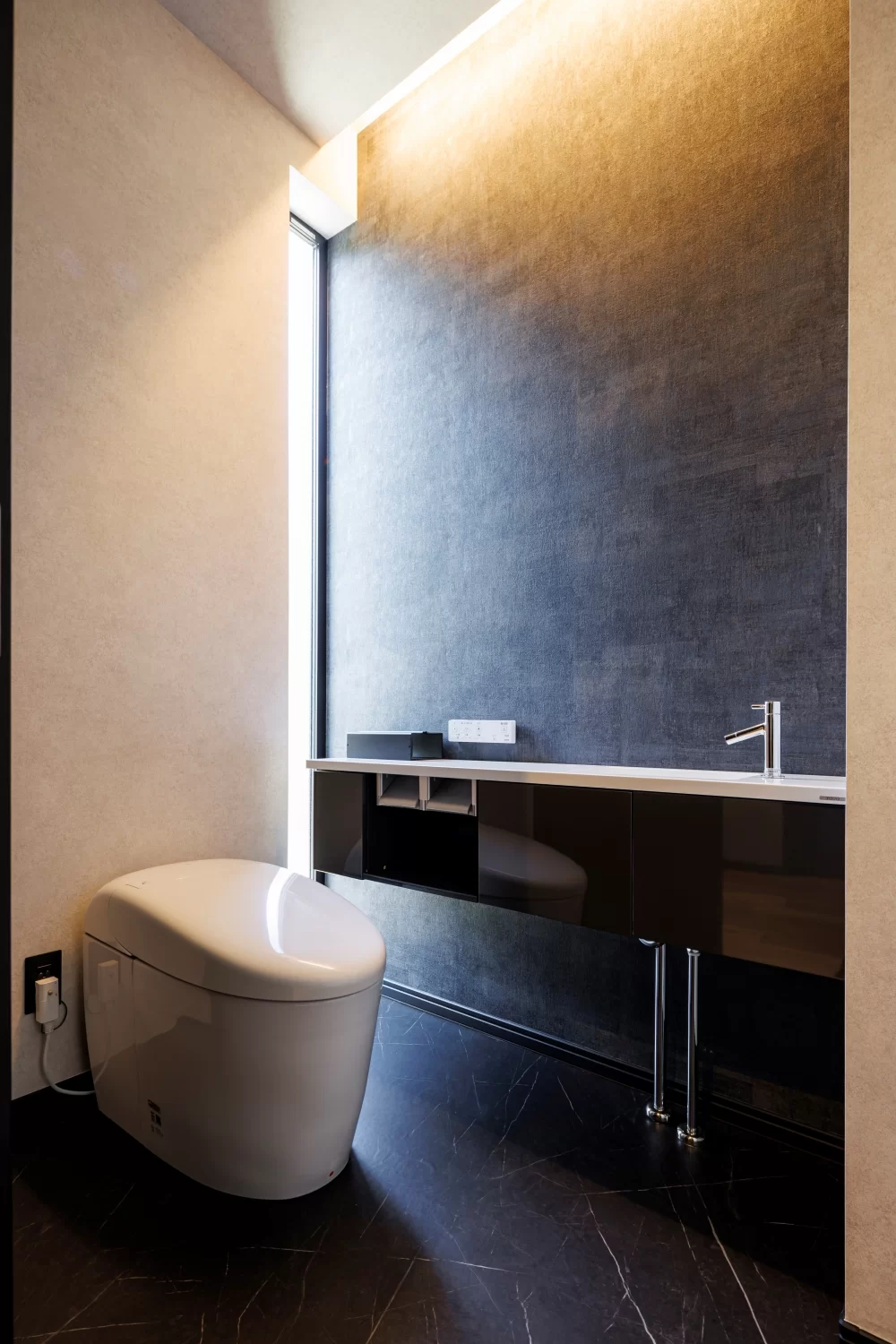 2つの洗面を備え、ブラックで統一されたスタイリッシュな空間は、朝の身支度を快適にサポートします。さらに、ユーティリティやトイレなどの水回りを集約し、家事動線にも配慮しました。