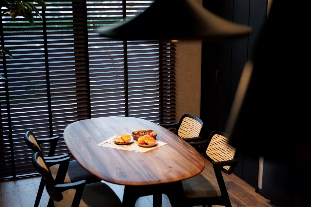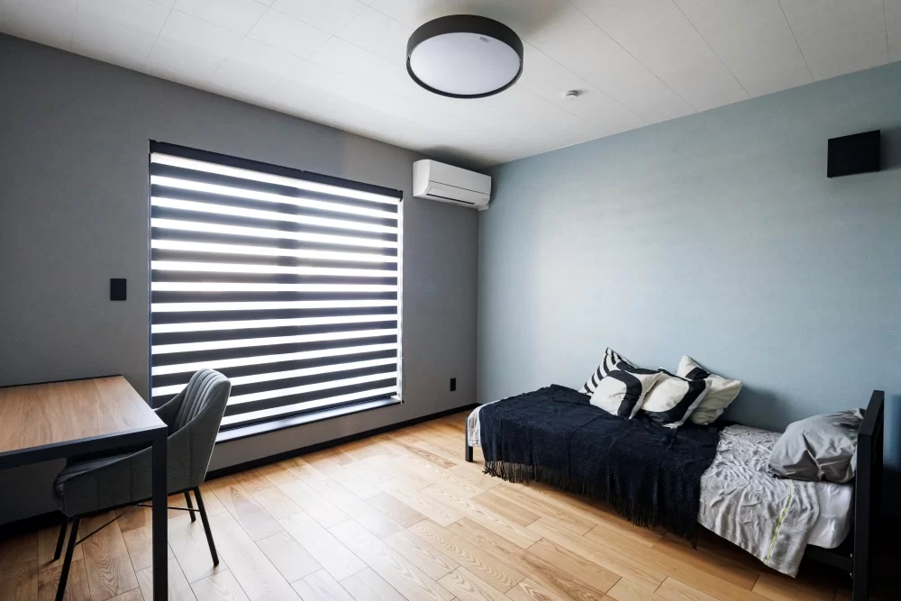 壁一面にあしらった飾り木目と、それをやさしく照らす間接照明が、落ち着きと上質感を両立させた贅沢な空間を演出します。ゆったりとした時間が流れる、大人のための特別な寝室です。